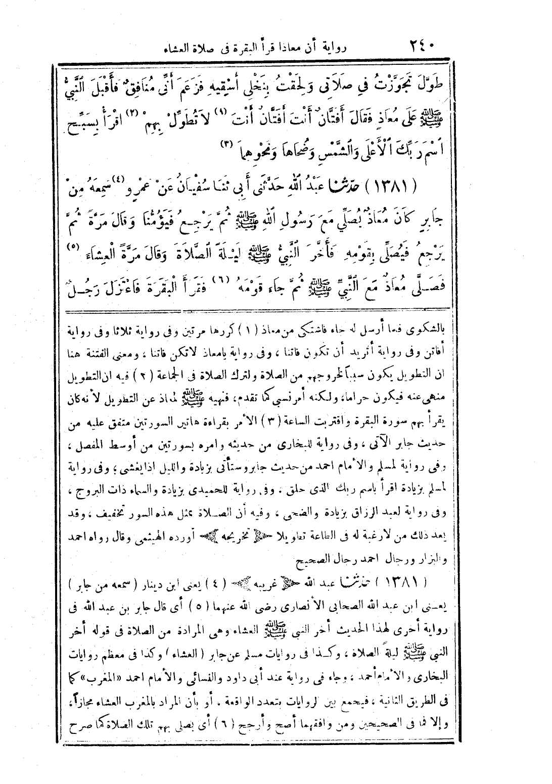 (1381) حدّثنا عبد الله حدَّثنى أبى ثناسفيان عن عمرٍو سمعه من جابرٍ كان معاذٌ يصلِّي مع رسول الله صلى الله عليه وسلم ثمَّ يرجع فيؤمُّنا وقال مرةً ثمَّ يرجع فيصلِّى بقومه فأخَّر النَّبيُّ صلى الله عليه وسلم ليلةً الصَّلاة وقال مرَّةً العشاء فصلَّى معاذٌ مع النَّبيِّ صلى الله عليه وسلم ثم جاء قومه فقرأ البقرة فاعتزل رجلٌ