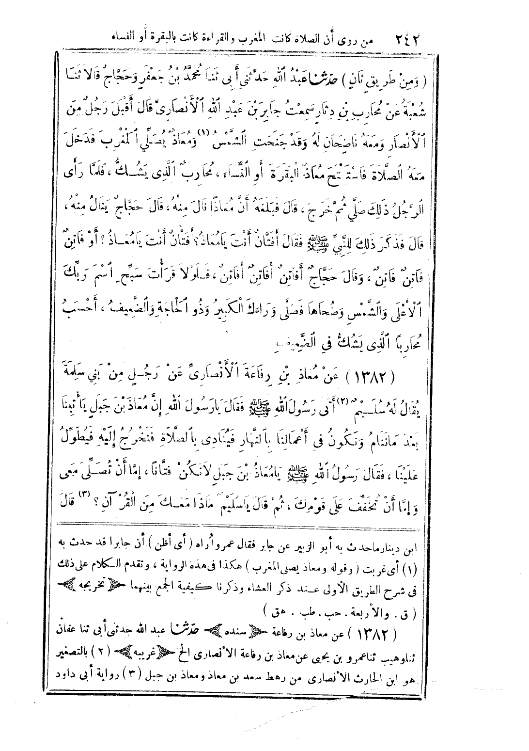 (ومن طريقٍ ثانٍ) حدّثنا عبد الله حدَّثنى أبى ثنا محمَّد بن جعفرٍ وحجَّاجٌ قالا ثنا شعبة عن محارب بن دثارٍ سمعت جابر بن عبد الله الأنصارىَّ قال أقبل رجلٌ من الأنصار ومعه ناضحان له وقجد جنحت الشَّمس ومعاذٌ يصلي المغرب فدخل معه الصلَّاة فاستفتح معاذٌ البقرة أو النِّساء، محاربٌ الَّذى يشكُّ، فلمَّا رأى الرَّجل ذلك صلَّي ثمَّ خرج، قال فبلغه أنَّ معاذًا نال منه، قال حجَّاجٌ ينال منه، قال فذكر ذلك للنَّبيِّ صلى الله عليه وسلم فقال أفتَّانٌ أنت يا معاذ؟ أفتَّانٌ أنت يا معاذ؟ أو فاتنٌ فاتنٌ فاتنٌ، وقال حجَّاجٌ أفاتنٌ أفاتنٌ، فلولا قرأت سبِّح اسم ربِّك الأعلى والشَّمس وضحاها فصلَّى وراءك الكبير وذو الحاجة والضَّعيف، أحسب محاربًا الَّذى يشكُّ فى الضَّعيف