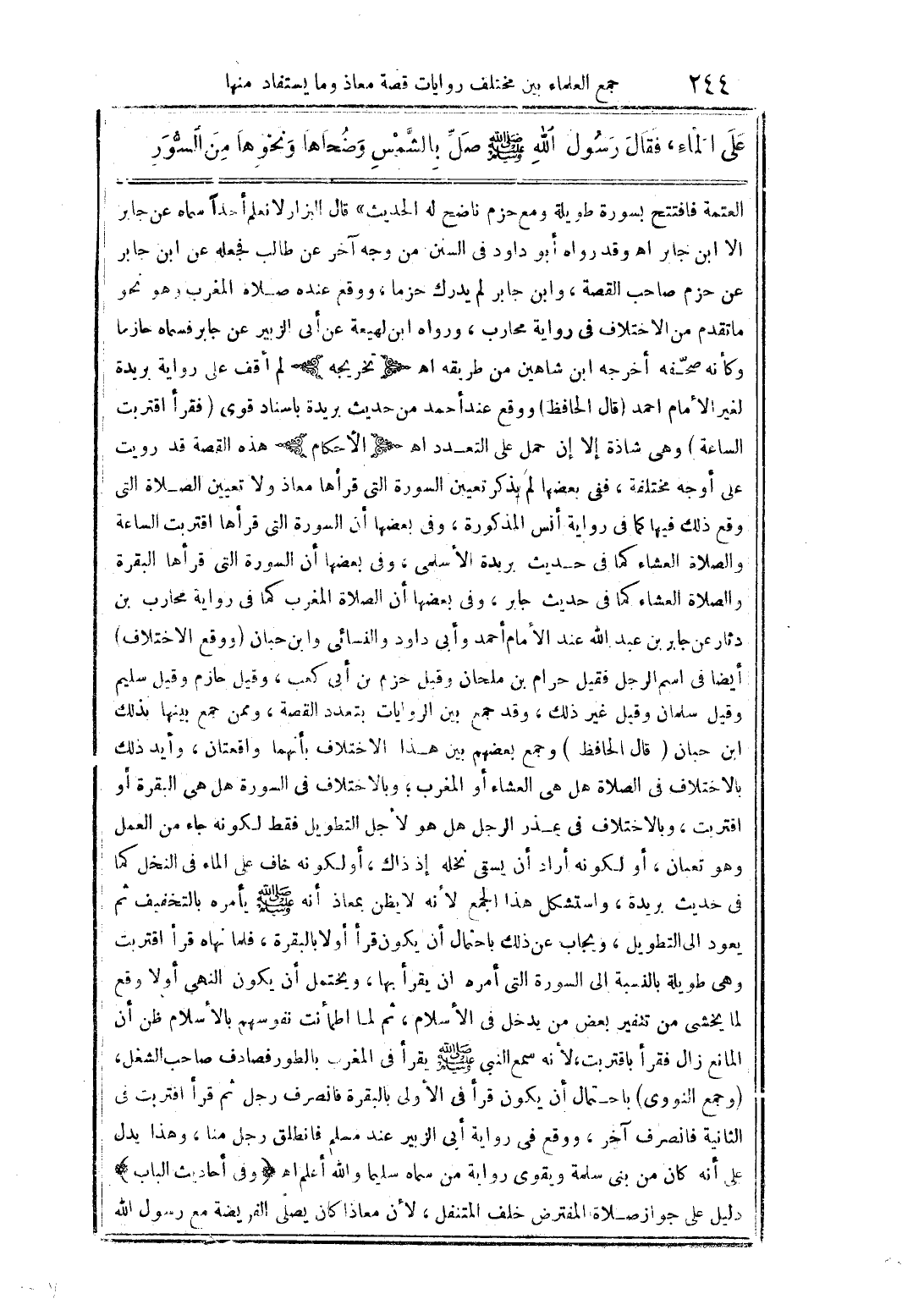 العتمة فافتتح بسورة طويلة ومع حزم ناضح له الحديث" قال البزار لا نعلم أحدًا سماه عن جابر إلا ابن جابر اهـ وقد رواه أبو داود في السنن من وجه آخر عن طالب فجعله عن ابن جابر عن حزم صاحب القصة، وابن جابر لم يدرك حزما، ووقع عنده صلاة المغرب وهو نحو ما تقدم من الاختلاف في رواية محارب، ورواه ابن لهيعة عن أبي الزبير عن جابر فسماه حازما وكأنه صحفه أخرجه ابن شاهين من طريقه اهـ (تخريجه) لم أقف على رواية بريدة لغير الأمام أحمد (قال الحافظ) ووقع عند أحمد من حديث بريدة بإسناد قوي (فقرأ اقتربت الساعة) وهي شاذة إلا إن حمل على التعدد اهـ (الأحكام) هذه القصة قد رويت على أوجه مختلفة، ففي بعضها لم يذكر تعين السورة التي قرأها معاذ ولا تعيين الصلاة التي وقع ذلك فيها كما في رواية أنس المذكورة، وفي بعضها أن السورة التي قرأها اقتربت الساعة والصلاة العشاء كما في حديث بريدة الأسلمي، وفي بعضها أن السورة التي قرأها البقرة والصلاة العشاء كما في حديث جابر، وفي بعضها أن الصلاة المغرب كما في رواية محارب بن دثار عن جابر بن عبد الله عند الأمام أحمد وأبي داود والنسائي وابن حبان (ووقع الاختلاف) أيضا في اسم الرجل فقيل حرام بن ملحان وقيل حزم بن أبي كعب، وقيل حازم وقيل سليم وقيل سلمان وقيل غير ذلك، وقد جمع بين الروايات بتعدد القصة، وممن جمع بينها بذلك ابن حبان (قال الحافظ) وجمع بعضهم بين هذا الاختلاف بأنهما واقعتان، وأيد ذلك بالاختلاف في الصلاة هل هي العشاء أو المغرب؛ وبالاختلاف في السورة هل هي البقرة أو اقتربت، وبالاختلاف في عذر الرجل هل هو لأجل التطويل فقط لكونه جاء من العمل وهو تعبان، أو لكونه أراد أن يسقى نخله إذا ذاك، أو لكونه خاف على الماء في النخل كما في حديث بريدة، واستشكل هذا الجمع لأنه لا يظن بمعاذ أنه صلى الله عليه وسلم يأمره بالتخفيف ثم يعود إلى التطويل، ويجاب عن ذلك باحتمال أن يكون قرأ أولا بالبقرة، فلما نهاه قرأ اقتربت وهي طويلة بالنسبة إلى السورة التي أمره أن يقرأ بها، ويحتمل أن يكون النهي أولا وقع لما يخشى من تنفير بعض من يدخل في الإسلام، ثم لما اطمأنت نفوسهم بالأسلام ظن أن المانع زال فقرأ باقتربت، لأنه سمع النبي صلى الله عليه وسلم يقرأ في المغرب بالطور فصادف صاحب الشغل، (وجمع النووي) باحتمال أن يكون قرأ في الأولى بالبقرة فانصرف رجل ثم قرأ اقتربت في الثانية فانصرف آخر، ووقع في رواية أبي الزبير عند مسلم فانطلق رجل منا، وهذا يدل على أنه كان من بني سلمة ويقوى رواية من سماه سليما والله أعلم اهـ (وفي أحاديث الباب) دليل على جواز صلاة المفترض خلف المتنفل، لأن معاذا كان يصلي الفريضة مع رسول الله