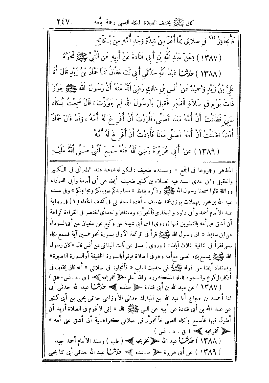 (1388) حدّثنا عبد الله حدَّثنى أبى ثنا عفَّان ثنا حمَّاد بن زيدٍ قال أنا علىُّ بن زيد وحميدٌ عن انس بن مالكٍ رضى الله عنه أنَّ رسول الله صلى الله عليه وسلم جوَّز ذات يومٍ فى صلاة الفجر فقيل يا رسول الله لم جوَّزت؟ قال سمعت بكاء صبىّ فظننت أنَّ أمُّه معنا تصلِّى، فأردت أن أفرغ له أمه، وقد قال حَّمادٌ أيضًا فظننت أنَّ أمَّه تصلِّى معنا فأردت أن أفرغ له أمَّه