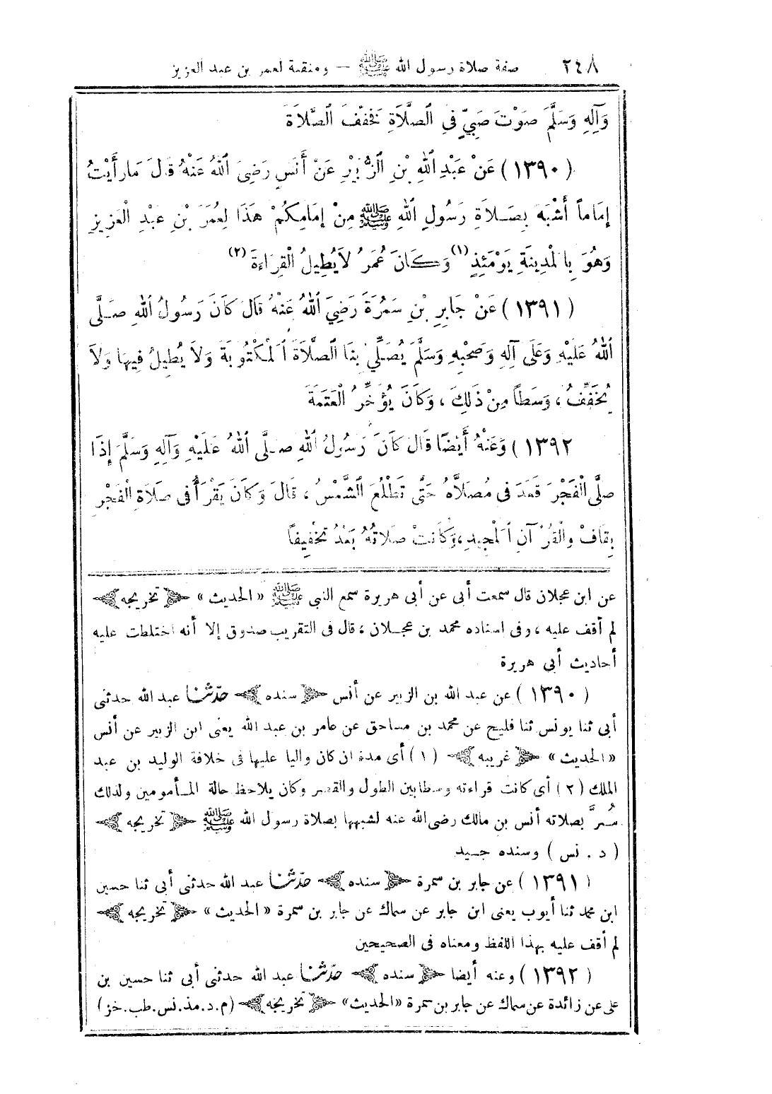 (1390) عن عبد الله بن الزُّبير عن أنس رضى الله عنه قال ما رأيت إمامًا أشبه بصلاة رسول الله صلى الله عليه وسلم من إمامكم هذا لعمر بن عبد العزيز وهو بالمدينة يومئذٍ وكان عمر لا يطيل القراءة