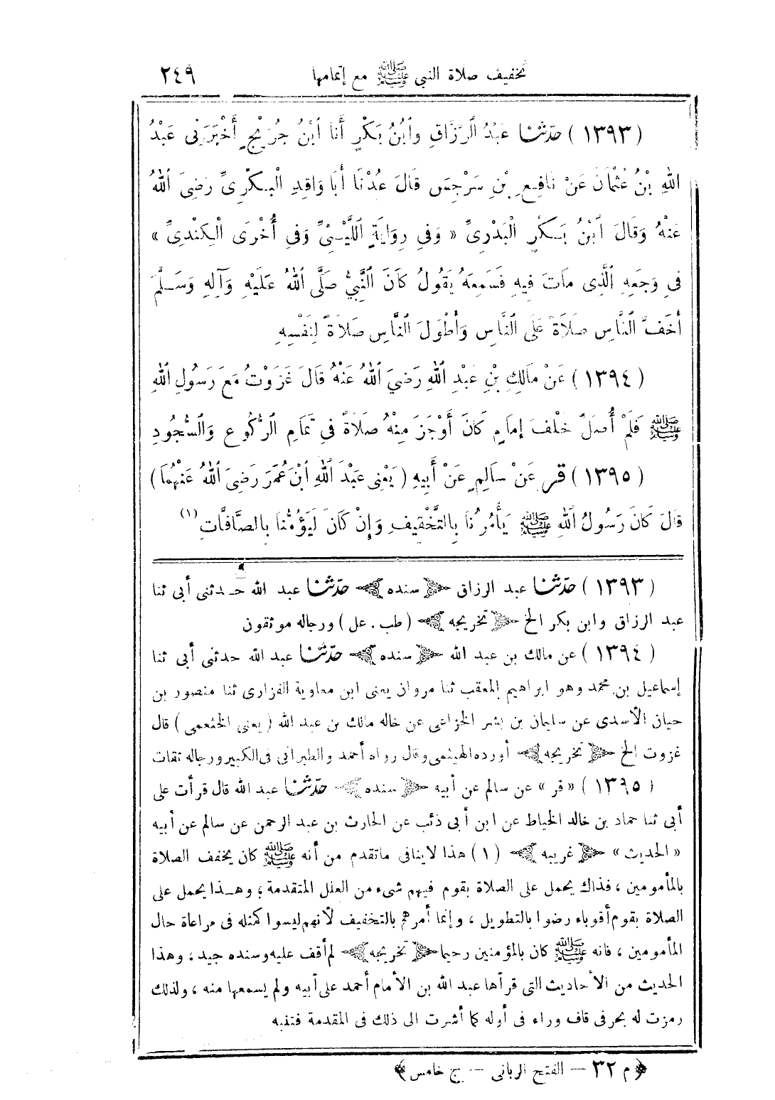(1393) حدّثنا عبد الرزَّاق وابن بكرٍ أنا جريجٍ أخبرنى عبد الله بن عثمان عن نافع بن سرجس قال عدنا أبا واقد البكرىِّ رضى الله عنه وقال ابن بكرٍ البدرىِّ "وفى روايةٍ اللَّيثىِّ وفى أخرى الكندىِّ" فى وجعه الَّذى مات فيه فسمعه يقول كان النَّبيُّ صلَّى الله عليه وآله وسلَّم أخفَّ النَّاس صلاة على النَّاس وأطول النَّاس صلاةً لنفسه