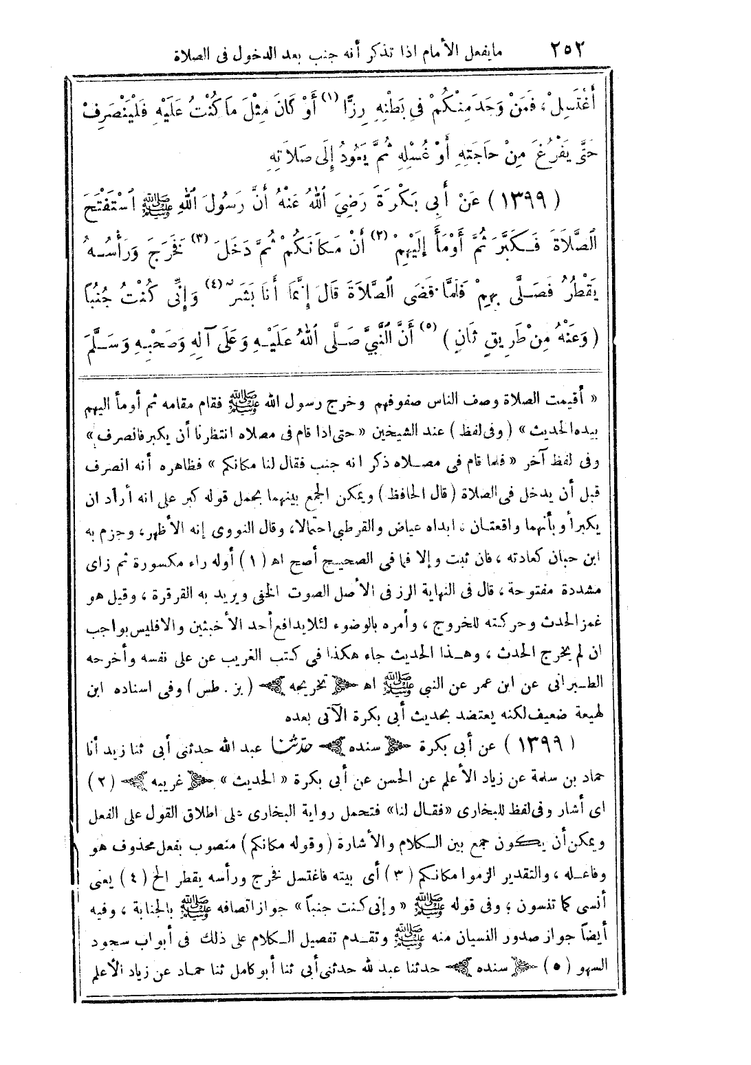 (1399) عن أبى بكرة رضي الله عنه أنَّ رسول الله صلى الله عليه وسلم استفتح الصَّلاة فكبَّر ثمَّ أومأ إليهم أن مكانكم ثمَّ دخل فخرج وراسه يقطر فصلَّى بهم فلمَّا قضى الصَّلاة قال إنَّما أنا بشرٌ وإنِّى كنت جنبًا (وعنه من طريقٍ ثانٍ) أنَّ النبيَّ صلَّى الله عليه وعلى آله وصحبه وسلَّم