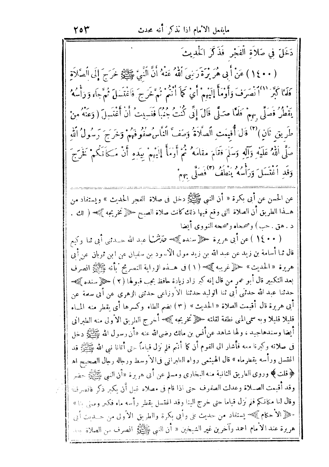 (1400) عن أبى هريرة (سنده) حدثنا عبد الله حدثنى أبى ثنا وكيع قال ثنا أسامة بن زيد عن عبد الله بن زيد مولى الأسود بن سفيان عن ابن ثوبان عن أبى هريرة "الحديث" (غريبه) (1) فى هذه الرواية التصريح بأنه صلى الله عليه وسلم انصرف بعد التكبير قال أبو عمر من قال إنه كبر زاد زيادة حافظ يجب قبولها (2) (سنده) حدثنا عبد الله حدثنى أبى ثنا الوليد حدثنا الأوزاعى حدثنى الزهرى عن أبى سلمة عن أبى هريرة قال أقيمت الصلاة "الحديث" (3) بضم الطاء وكسرها أى يقطر منه الماء قليلا قليلا وبه سمى المنى نطفة لقلته (تخريجه) أخرج الطريق الأولى منه الطبرانى أيضا وسندها جيد، ولها شاهد عن أنس بن مالك رضى الله عنه "أن رسول الله صلى الله عليه وسلم دخل فى صلاته وكبرنا معه فأشار الى القوم أن كما أنتم فلم نزل قيامًا حتى أتانا نبى الله صلى الله عليه وسلم وقد اغتسل ورأسه يقطر ماء" قال الهيثمى رواه الطبرانى فى الأوسط ورجاله رجال الصحيح اهـ (قلت) وروى الطريق الثانية منه البخارى ومسلم عن أبى هريرة "أن النبى صلى الله عليه وسلم حضر وقد أقيمت الصلاة وعدلت الصفوف حتى اذا قام فى مصلاه قبل أن يكبر ذكر فانصرف وقال لنا مكانكم فلم قياما حتى خرج الينا وقد اغتسل يقطر رأسه ماء فكبر وملى بنا" (الأحكام) يستفاد من حديث على وأبى بكرة والطريق الأولى من حديث أبى هريرة عند الأمام احمد وآخرين غير الشيخين "أن النبى صلى الله عليه وسلم انصرف من الصلاة بعد