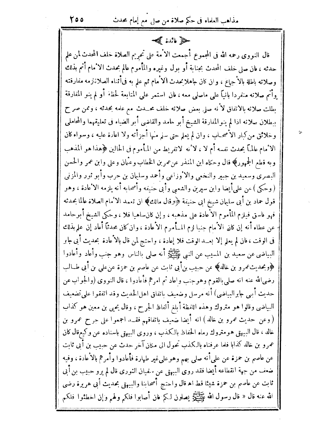 قال النووى رحمه الله فى المجموع أجمعت الأمة على تحريم الصلاة خلف المحدث لمن علم حدثه، فان صلى خلف المحدث بجنابة أو بول وغيره والمأموم عالم بحدث الأمام أتم بذلك وصلاته باطلة بالإجماع، وان كان جاهلا بحدث الأمام ثم علم به فى أثناء الصلاة لزمه مفارقته وأتم صلاته منفردا بانيًا على ما صلى معه، فان استمر على المتابعة لحظة أو لم ينو المفارقة بطلت صلاته بالاتفاق لأنه صلى بعض صلاته خلف محدث مع علمه بحدثه، وممن صرح ببطلان صلاته اذا لم ينو المفارقة الشيخ أبو حامد والقاضى أبو الضياء فى تعليقهما والمحاملى وخلائق من كبار الأصحاب، وان لم يعلم حتى سلم منها أجزأته ولا اعادة عليه، وسواء كان الأمام عالماً بحدث نفسه أم لا، لأنه لا تفريط من المأموم فى الحالين (هذا هو المذهب وبه قطع الجمهور) قال وحكاه ابن المنذر عن عمر بن الخطاب وعثمان وعلى وابن عمر والحسن البصرى وسعيد بن جبير والنخعى والأوزاعى وأحمد وسليمان بن حرب وأبو ثور والمزنى (وحكى) عن على أيضًا وابن سيرين والشعبى وأبى حنيفه وأصحابه أنه يلزمه الأعادة، وهو قول حماد بن أبى سليمان شيخ ابى حنيفه (وقال مالك) ان تعمد الأمام الصلاة عالما بحدثه فهو فاسق فيلزم المأموم الأعادة على مذهبه، وإن كان ساهيا فلا، وحكى الشيخ أبو حامد عن عطاء أنه إن كان الأمام جنبا لزم المأموم الأعادة، وان كان محدثًا أعاد إن علم بذلك فى الوقت، فان لم يعلم إلا بعد الوقت فلا إعادة، واحتج لمن قال بالأعادة بحديث أبى جابر البياضى عن سعيد بن المسيب عن النبى صلى الله عليه وسلم أنه صلى بالناس وهو جنب وأعاد وأعادوا (وبحديث عمرو بن خالد) عن حبيب بن أبى ثابت عن عاصم بن حمزة عن على بن أبى طالب رضى الله عنه انه صلى بالقوم وهو جنب واعاد ثم امرهم فأعادوا، قال النووى (والجواب عن حديث أبى جابر البياضى) أنه مرسل وضعيف باتفاق اهل الحديث وقد اتفقوا على تضعيف البياضى وقالوا هو متروك وهذه اللفظة أبلغ ألفاظ الجرح، وقال يحيى بن معين هو كذاب (وعن حديث عمرو بن خالد) انه أيضا ضعيف باتفاقهم فقد اجمعوا على جرح عمرو بن خالد، قال البيهقى هو متروك رماه الحفاظ بالكذب، وروى البيهقى باسناده عن وكيع قال كان عمرو بن خالد كذابا فلما عرفناه بالكذب تحول الى مكان آخر حدث عن حبيب بن أبى ثابت عن عاصم بن حمزة عن على أنه صلى بهم وهو على غير طهارة فأعادوا وأمرهم بالأعادة، وفيه ضعف من جهة انقطاعه أيضا فقد روى البيهقى عن سفيان الثورى قال لم يرو حبيب بن أبى ثابت عن عاصم بن حمزة شيئا قط اهـ قال واحتج أصحابنا والبيهقى بحديث أبى هريرة رضى الله عنه قال "قال رسول الله صلى الله عليه وسلم يصلون لكم فان أصابوا فلكم ولهم وإن اخطئوا فلكم