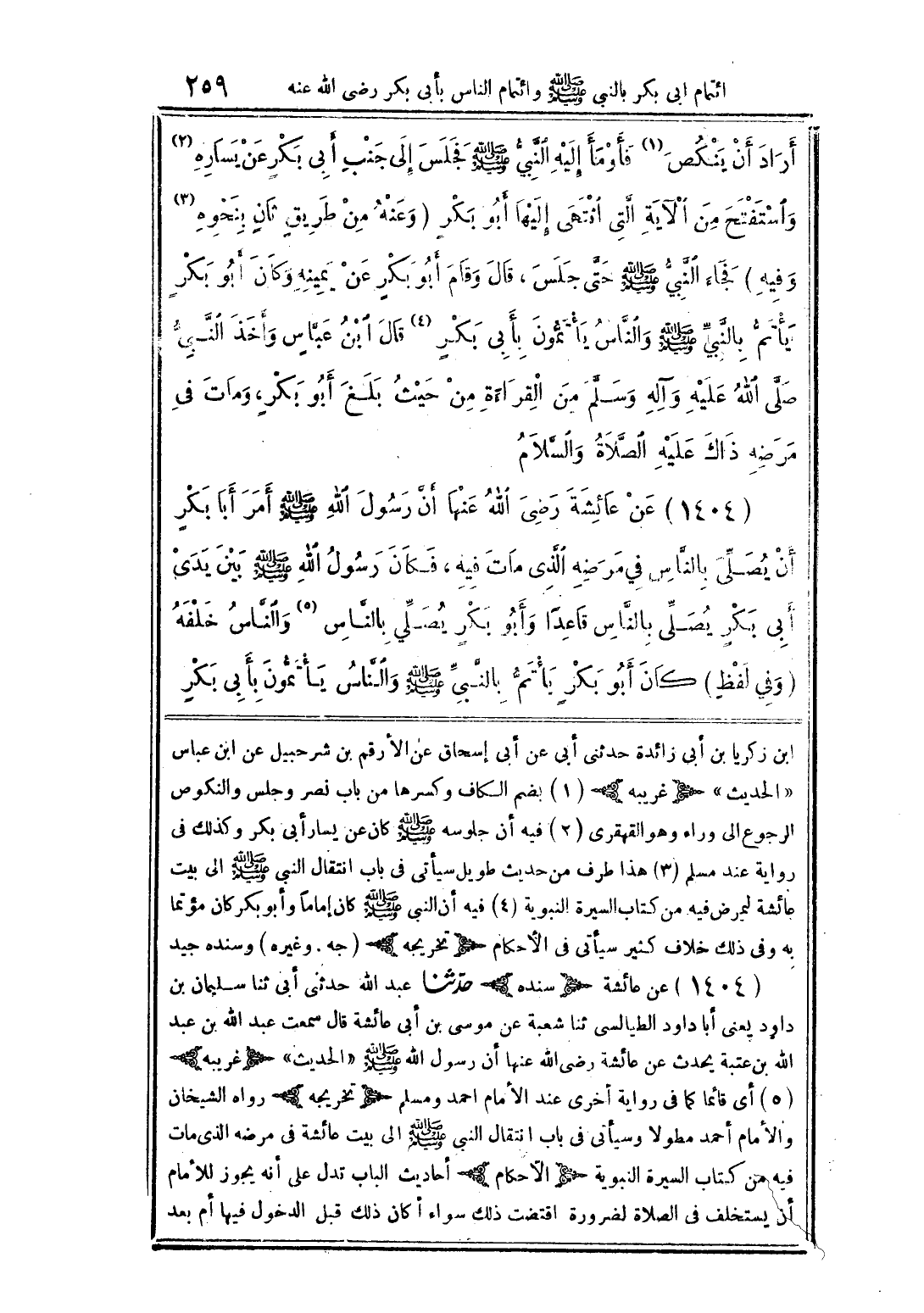 عن عائشة رضى الله عنها أنَّ رسول الله صلى الله عليه وسلم أمر أبا بكرٍ أن يصلَّى بالنَّاس في مرضه الَّذى مات فيه، فكان رسول الله صلى الله عليه وسلم بين يدى أبى بكرٍ يصلِّى بالنَّاس قاعدًا وأبو بكرٍ يصلِّى بالنَّاس والنَّاس خلفه (وفي لفظٍ) كان أبو بكرٍ يأتمُّ بالنَّبيِّ صلى الله عليه وسلم والنَّاس يأتمُّون بأبي بكرٍ