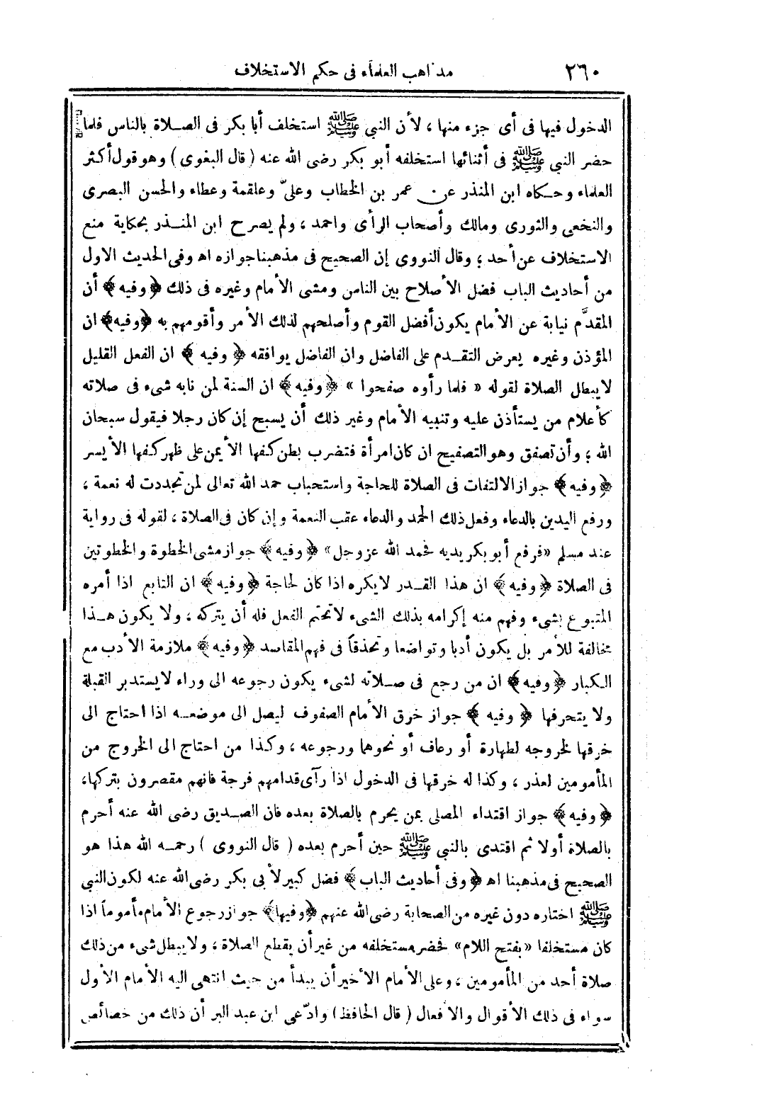 الدخول فيها فى أى جزء منها، لأن النبى صلى الله عليه وسلم استخلف أبا بكر فى الصلاة بالناس فلما حضر النبى صلى الله عليه وسلم فى أثنائها استخلفه أبو بكر رضى الله عنه (قال البغوى) وهو قول أكثر العلماء وحكاه ابن المنذر عن عمر بن الخطاب وعلىّ وعلقمة وعطاء والحسن البصرى والنخعى والثورى ومالك وأصحاب الرأى واحمد، ولم يصرح ابن المنذر بحكاية منع الاستخلا عن أحد؛ وقال النووى إن الصحيح فى مذهبنا جوازه اهـ وفى الحديث الاول من أحاديث الباب فضل الأصلاح بين الناس ومشى الأمام وغيره فى ذلك (وفيه) أن المقدَّم نيابة عن الامام يكون أفضل القوم وأصلحهم لذلك الأمر وأقومهم به (وفيه) ان المؤذن وغيره يعرض التقدم على الفاضل وان الفاضل يوافقه (وفيه) ان الفعل القليل لا يبطل الصلاة لقوله "فلما رأوه صفحوا" (وفيه) ان السنة لمن نابه شئ فى صلاته كأعلام من يستأذن عليه وتنبيه الأمام وغير ذلك أن يسبح إن كان رجلا فيقول سبحان الله؛ وأن تصفق وهو التصفيح ان كان امرأة فتضرب بطن كفها الأيمن على ظهر كفها الأيسر (وفيه) جواز الالتفات فى الصلاة للحاجة واستحباب حمد الله تعالى لمن تجددت له نعمة، ورفع اليدين بالدعاء وفعل ذلك الحمد والدعاء عقب النعمة وإن كان فى الصلاة، لقوله فى رواية عند مسلم "فرفع أبو بكر يديه فحمد الله عز وجل" (وفيه) جواز مشى الخطوة والخطوتين فى الصلاة (وفيه) ان هذا القدر لا يكره اذا كان لحاجة (وفيه) ان التابع اذا أمره المتبوع بشئ وفهم منه إكرامه بذلك الشئ لا تحتم الفعل فله أن يتركه، ولا يكون هذا مخالفة للأمر بل يكون أدبا وتواضعا وتحذقًا فى فهم المقاصد (وفيه) ملازمة الأدب مع الكبار (وفيه) ان من رجع فى صلاته لشئ يكون رجوعه الى وراء لا يستدبر القبلة ولا يتحرفها (وفيه) جواز خرق الأمام الصفوف ليصل الى موضعه اذا احتاج الى حرقها لخروجه لطهارة أو رعاف أو نحوهما ورجوعه، وكذا من احتاج الى الخروج من المأمومين لعذر، وكذا له خرقها فى الدخول اذا رآى قدامهم فرجة فانهم مقصرون بتركها، (وفيه) جواز اقتداء المصلى بمن يحرم بالصلاة بعده فان الصديق رضى الله عنه أحرم بالصلاة أولا ثم اقتدى بالنبى صلى الله عليه وسلم حين أحرم بعده (قال النووى) رحمه الله هذا هو الصحيح فى مذهبنا اهـ (وفى أحاديث الباب) فضل كبير لأبى بكر رضى الله عنه لكون النبى صلى الله عليه وسلم اختاره دون غيره من الصحابة رضى الله عنهم (وفيها) جواز رجوع الأمام مأمومًا اذا كان مستخلفا "يفتح اللام" فحضر مستخلفه من غير أن يقطع الصلاة، ولا يبطل شئ من ذلك صلاة أحد من المأمومين، وعلى الأمام الأخير أن يبدأ من حيث انتهى اليه الأمام الأول سواء فى ذلك الأقوال والأفعال (قال الحافظ) وادّعى ابن عبد البر أن ذلك من خصائص