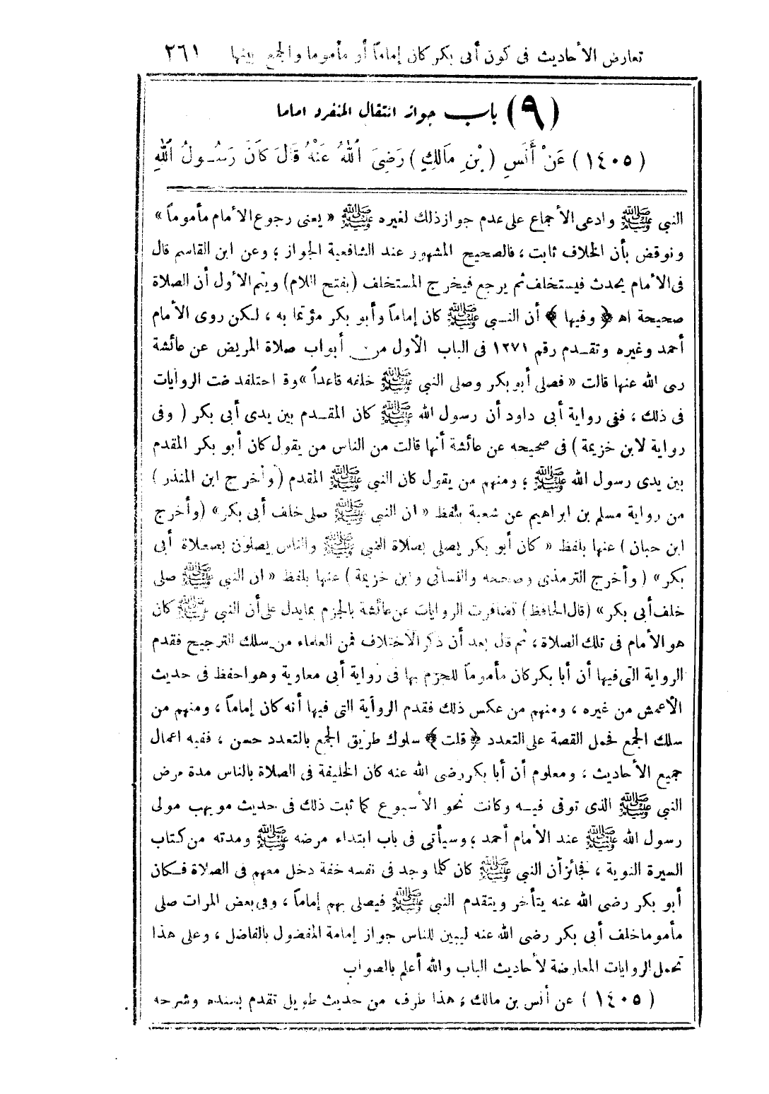 النبى صلى الله عليه وسلم وادعى الأجماع على عدم جواز ذلك لغيره صلى الله عليه وسلم "يعنى رجوع الأمام مأمومًا" ونوقض بأن الخلاف ثابت، فالصحيح المشهور عند الشافعية الجواز؛ وعن ابن القاسم قال فى الأمام يحدث فيستخلف ثم يرجع فيخرج المستخلف (بفتح اللام) ويتم الأول أن الصلاة صحيحة اهـ (وفيها) أن النبى صلى الله عليه وسلم كان إمامًا وأبو بكر مؤتما به، لكن روى الأمام أحمد وغيره وتقدم رقم 1271 فى الباب الأول من أبواب صلاة المريض عن عائشة رضى الله عنها قالت "فصلى أبو بكر وصلى النبى صلى الله عليه وسلم خلفه قاعدًا" وقد احتلفد ضت الروايات فى ذلك، ففى رواية أبى داود أن رسول الله صلى الله عليه وسلم كان المقدم بين يدى أبى بكر (وفى رواية لابن خزيمة) فى صحيحه عن عائشة أنها قالت من الناس من يقول كان أبو بكر المقدم بين يدى رسول الله صلى الله عليه وسلم؛ ومنهم من يقول كان النبى صلى الله عليه وسلم المقدم (وأخرج ابن المنذر) من رواية مسلم بن ابراهيم عن شعبة بلفظ "ان النبى صلى الله عليه وسلم صلى خلف أبى بكر" (وأخرج ابن حبان) عنها بلفظ "كان أبو بكر يصلى بصلاة النبى صلى الله عليه وسلم والناس يصلون بصلاة أبى بكر" (وأخرج الترمذى وصححه والنسائى وابن خزيمة) عنها بلفظ "ان النبى صلى الله عليه وسلم صلى خلف أبى بكر" (قال الحافظ) تضافرت الروايات عن عن عائشة بالجزم بما يدل على أن النبى صلى الله عليه وسلم كان هو الأمام فى تلك الصلاة، ثم قال بعد أن ذكر الاختلاف فمن العلماء من سلك الترجيح فقدم الرواية التى فيها أن أبا بكر كان مأمومًا للجزم بها فى رواية أبى معاوية وهو احفظ فى حديث الأعمش من غيره، ومنهم من عكس ذلك فقدم الرواية التى فيها أنه كان إمامًا، ومنهم من سلك الجمع فحمل القصة على التعدد (قلت) سلوك طريق الجمع بالتعدد حسن، ففيه اعمال جميع الأحاديث، ومعلوم أن أبا بكر رضى الله عنه كان الخليفة فى الصلاة بالناس مدة مرض النبى صلى الله عليه وسلم الذى توفى فيه وكانت نحو الأسبوع كما ثبت ذلك فى حديث مو يهب مولى رسول الله صلى الله عليه وسلم عند الأمام أحمد؛ وسيأتى فى باب ابتداء مرضه صلى الله عليه وسلم ومدته من كتاب السيرة النبوية، فجائز أن النبى صلى الله عليه وسلم كام كلما وجد فى نفسه خفة دخل معهم فى الصلاة فكان أبو بكر رضى الله عنه يتأخر ويتقدم النبى صلى الله عليه وسلم فيصلى بهم إمامًا، وفى بعض المرات صلى مأموما خلف أبى بكر رضى الله عنه ليبين للناس جواز إمامه المفضول بالفاضل، وعلى هذا تحمل الروايات المعارضة لأحاديث الباب والله أعلم بالصواب