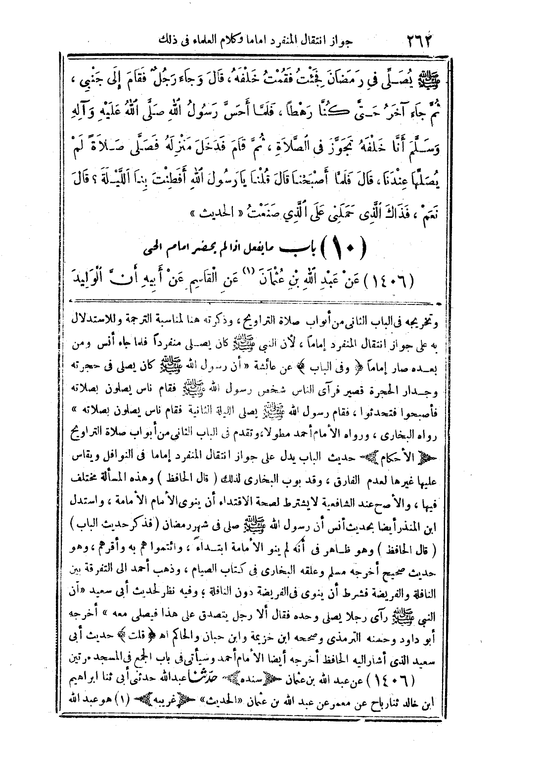 وتخريجه فى الباب الثانى من أبواب صلاة التراويح، وذكرته هنا لمناسبة الترجمة وللاستدلال به على جواز انتقال المنفرد إمامًا، لأن النبى صلى الله عليه وسلم كان يصلى منفردًا فلما جاء أنس ومن بعده صار إمامًا (وفى الباب) عن عائشة "أن رسول الله صلى الله عليه وسلم كان يصلى فى حجرته وجدار الحجرة فصير فرآى الناس شخص رسول الله صلى الله عليه وسلم فقام ناس يصلون بصلاته فأصبحوا فتحدثوا، فقام رسول الله صلى الله عليه وسلم يصلى الليلة الثانية فقام ناس يصلون بصلاته" رواه البخارى، ورواه الأمام أحمد مطولا، وتقدم فى الباب الثانى من أبواب صلاة التراويح (الأحكام) حديث الباب يدل على جواز انتقال المنفرد إماما فى النوافل ويقاس عليها غيرها لعدم الفارق، وقد بوب البخارى لذلك (قال الحافظ) وهذه المسألة مختلف فيها، والأصح عند الشافعية لا يشترط لصحة الاقتداء أن ينوى الأمام الأمامة، واستدل ابن المنذر أيضا بحديث أنس أن رسول الله صلى الله عليه وسلم صلى فى شهر رمضان (فذكر حديث الباب) (قال الحافظ) وهو ظاهر فى أنه لم ينو الأمامة ابتداءً، وائتموا هم به وأقرهم، وهو حديث صحيح أخرجه مسلم وعلقه البخارى فى كتاب الصيام، وذهب أحمد الى التفرقة بين النافلة والفريضة فشرط أن ينوى فى الفريضة دون النافلة؛ وفيه نظر لحديث أبى سعيد "أن النبى صلى الله عليه وسلم رآى رجلا يصلى وحده فقال ألا رجل يتصدق على هذا فيصلى معه" أخرجه أبو داود وحصنه الترمذى وصححه ابن خزيمة وابن حبان والحاكم اهـ (قلت) حديث أبى سعيد الذى أشار اليه الحافظ أخرجه أيضا الأمام أحمد وسيأتى فى باب الجمع فى المسجد مرتين