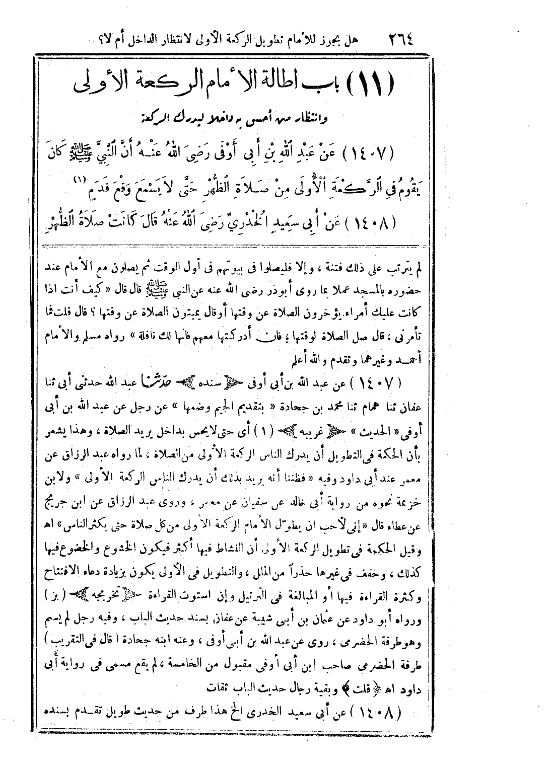 عن عبد الله بن أبى أوفى رضى الله عنه أنَّ النَّبيَّ صلى الله عليه وسلم كان يقوم فى الرَّكعة الأولى من صلاة الظُّهر حتَّى لا يسمع وقع قدمٍ