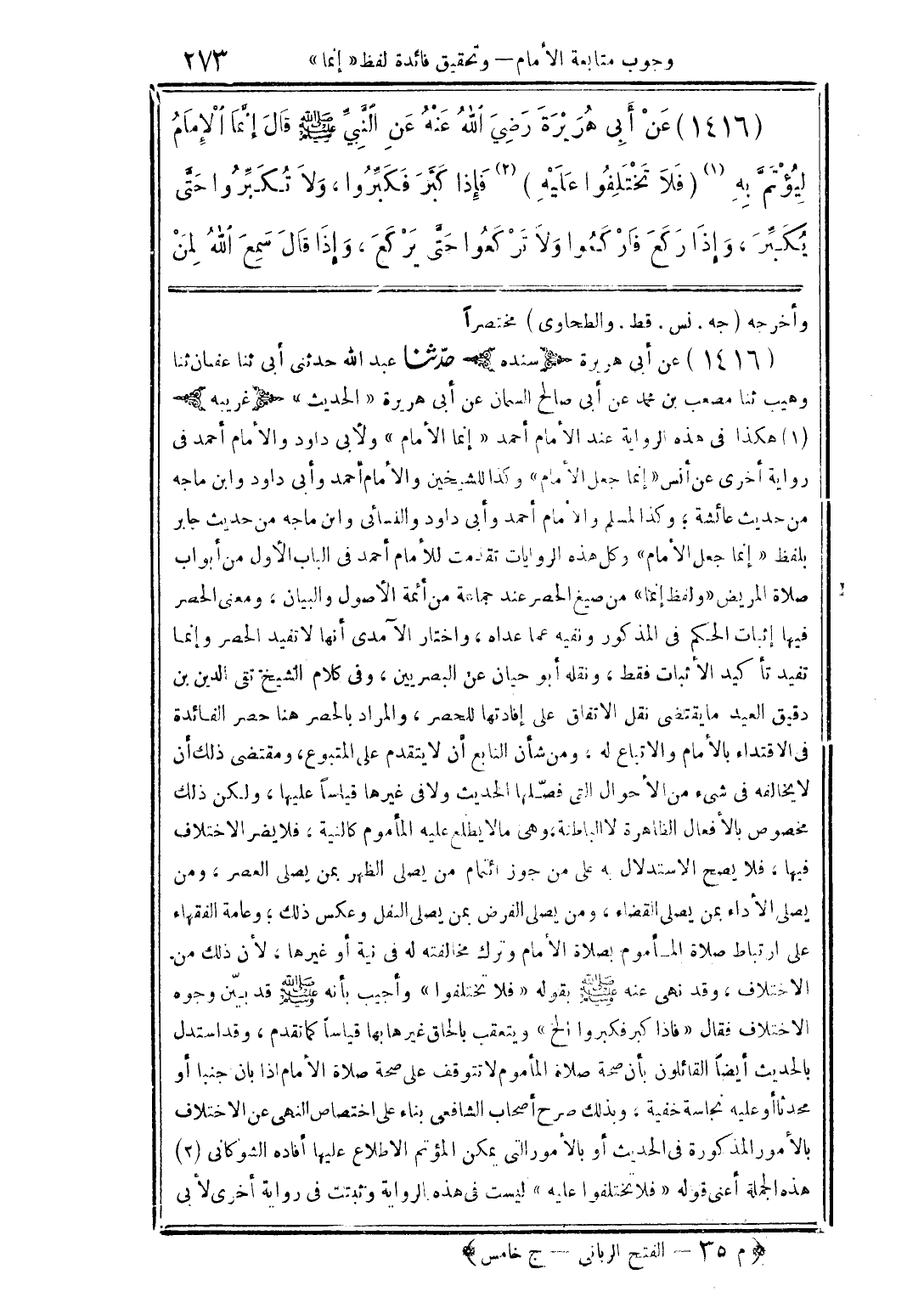 (1416) عن أبى هريرة (سنده) حدّثنا عبد الله حدثني أبى ثنا عفان ثنا وهيب ثنا مصعب بن محمد عن أبى صالح السمان عن أبى هريرة "الحديث" (غريبه) (1) هكذا في هذه الرواية عند الإمام أحمد "إنما الإمام" ولأبى داود والإمام أحمد في رواية أخرى عن أنس "إنما جعل الإمام" وكذا للشيخين والإمام أحمد وأبى داود وابن ماجه من حديث عائشة؛ وكذا لمسلم والإمام أحمد وأبى داود والنسائي وابن ماجه من حديث عائشة؛ وكذا لمسلم والإمام أحمد وأبى داود والنسائي وابن ماجه من حديث جابر بلفظ "إنما جعل الإمام" وكل هذه الروايات تقدمت للإمام أحمد في الباب الأول من أبواب صلاة المريض "ولفظ إنما" من صيغ الحصر عند جماعة من أئمة الأصول والبيان، ومعنى الحصر فيها إثبات الحكم في المذكور ونفيه عما عداه، واختار الآمدى أنها لا تفيد الحصر وإنما تفيد تأكيد الإثبات فقط، ونقله أبو حيان عن البصريين، وفي كلام الشيخ تقي الدين بن دقيق العيد ما يقتضى نقل الاتفاق على إفادتها للحصر، والمراد بالحصر هنا حصر الفائدة في الاقتداء بالإمام والإتباع له، ومن شأن النابع أن لا يتقدم على المتبوع، ومقتضى ذلك أن لا يخالفه في شيء من الأحوال التي فصّلها الحديث ولا في غيرها قياسًا عليها، ولكن ذلك مخصوص بالأفعال الظاهرة لا الباطنة، وهي ما لا يطلع عليه المأموم كالنية، فلا يضر الاختلاف فيها، فلا يصح الاستدلال به على من جوز ائتمام من يصلى الظهر بمن يصلى العصر، ومن يصلى الأداء بمن يصلى القضاء، ومن يصلى الفرض بمن يصلى النفل وعكس ذلك؛ وعامة الفقهاء على ارتباط صلاة المأموم بصلاة الإمام وترك مخالفته له في نية أو غيرها، لأن ذلك من الاختلاف، وقد نهى عنه صلى الله عليه وسلم بقوله "فلا تختلفوا" وأجيب بأنه صلى الله عليه وسلم قد بيّن وجوه الاختلاف فقال "فإذا كبر فكبروا الخ" ويتعقب بالحاق غيرها بها قياسًا كما تقدم، وقد استدل بالحديث أيضًا القائلون بأن صحة صلاة المأموم لا تتوقف على صحة صلاة الإمام إذا بان جنبا أو محدثا أو عليه نجاسة خفية، وبذلك صرح أصحاب الشافعي بناء على اختصاص النهى عن الاختلاف بالأمور المذكورة في الحديث أو بالأمور التي يمكن المؤتم الإطلاع عليها أفاده الشوكاني (2) هذه الجملة أعنى قوله "فلا تختلفوا عليه" ليست في هذه الرواية وتثبت في رواية أخرى لأبي