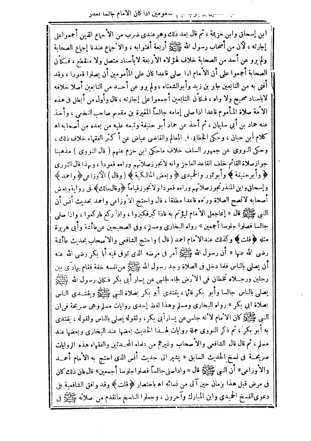 ابن إسحاق وابن خزيمة، ثم قال بعد ذلك وهو عندي ضرب من الأجماع الذين أجمعوا على إجازته، لأن من أصحاب رسول الله صلى الله عليه وسلم أربعة أفتوا به، والأجماع عندنا إجماع الصحابة ولم يرو عن أحد من الصحابة خلاف لهؤلاء الأربعة لا بإسناد متصل لا منقطع، فكأن الصحابة أجمعوا على أن الإمام إذا صلى قاعدا كان على المأمومين أن يصلوا قعودا، وقد أفتى به من التابعين جابر بن زيد وأبو الشعثاء، ولم يرو عن أحد من التابعين أصلا خلافه لا بإسناد صحيح ولا واه، فكان التابعين أجمعوا على إجازته، قال وأول من أبطل في هذه الأمة صلاة المأموم قاعدا إذا صلى إمامه جالسًا المغيرة بن مقسم صاحب النخعي، وأخذ عنه حماد بن أبي سليمان، ثم أخذ عن حماد أبو حنيفة وتبعه عليه من بعده من أصحابه اهـ كلام ابن حبان، وحكى الخطابي في المعالم والقاضي عياض عن أكثر الفقهاء خلاف ذلك، وحكى النووي عن جمهور السلف خلاف ما حكى ابن حزم عنهم (قال النووي) مذهبنا جواز صلاة القائم خلف القاعد العاجز وأنه لا تجوز صلاتهم وراءه قعودا، وبهذا قال الثوري (وأبو حنيفة) وأبو ثور والحميدي (وبعض المالكية) (وقال) الأوزاعي (وأحمد) وإسحاق وابن المنذر تجوز صلاتهم وراءه قعودا ولا تجوز قيامًا (وقال مالك) في رواية وبعض أصحابه لا تصح الصلاة وراءه قاعدا مطلقا، قال واحتج الأوزاعي وأحمد بحديث أنس أن النبي صلى الله عليه وسلم قال "إنما جعل الأمام ليؤتم به فإذا كبر فكبروا، وإذا ركع فاركعوا، وإذا صلى جالسا فصلوا جلوسا أجمعين" رواه البخاري ومسلم، وفي الصحيحين عن عائشة وأبي هريرة مثله (قلت) وكذلك عند الأمام أحمد (قال) واحتج الشافعي والأصحاب بحديث عائشة رضي الله عنها "أن رسول الله صلى الله عليه وسلم أمر في مرضه الذي توفي فيه أبا بكر رضي الله عنه أن يصلي بالناس فلما دخل في الصلاة وجد رسول الله صلى الله عليه وسلم من نفسه خفة فقام يهادي بين رجلين ورجلاه تخطان في الأرض فجاء فجلس عن يسار أبي بكر فكان رسول الله صلى الله عليه وسلم يصلي بالناس جالسا وأبو بكر قائما، يقتدي أبو بكر بصلاة النبي صلى الله عليه وسلم ويقتدي الناس بصلاة أبي بكر" رواه البخاري ومسلم وهذا لفظ إحدى روايات مسلم وهي صريحة في أن النبي صلى الله عليه وسلم كان الأمام لأنه جلس عن يسار أبي بكر، ولقوله يصلي بالناس ولقوله، يقتدي به أبو بكر، ثم ذكر النووي جملة روايات لهذا الحديث بعضها عند البخاري وبعضها عند مسلم، ثم قال قال الشافعي والأصحاب وغيرهم من علماء المحدثني والفقهاء هذه الروايات صريحة في نسخ الحديث السابق "يشير إلى حديث أنس الذي احتج به الأمام أحمد والأوزاعي" أن النبي صلى الله عليه وسلم قال "وإذا صلى جالسا فصلوا جلوسا أجمعين" قال فإن ذلك كان في مرض قبل هذا بزمان حين آلى من نسائه اهـ باختصار (قلت) وقد وافق الشافعية على دعوى النسخ الحميدي وابن المبارك وآخرون، وجعلوا الناسخ ما تقدم من صلاته صلى الله عليه وسلم في