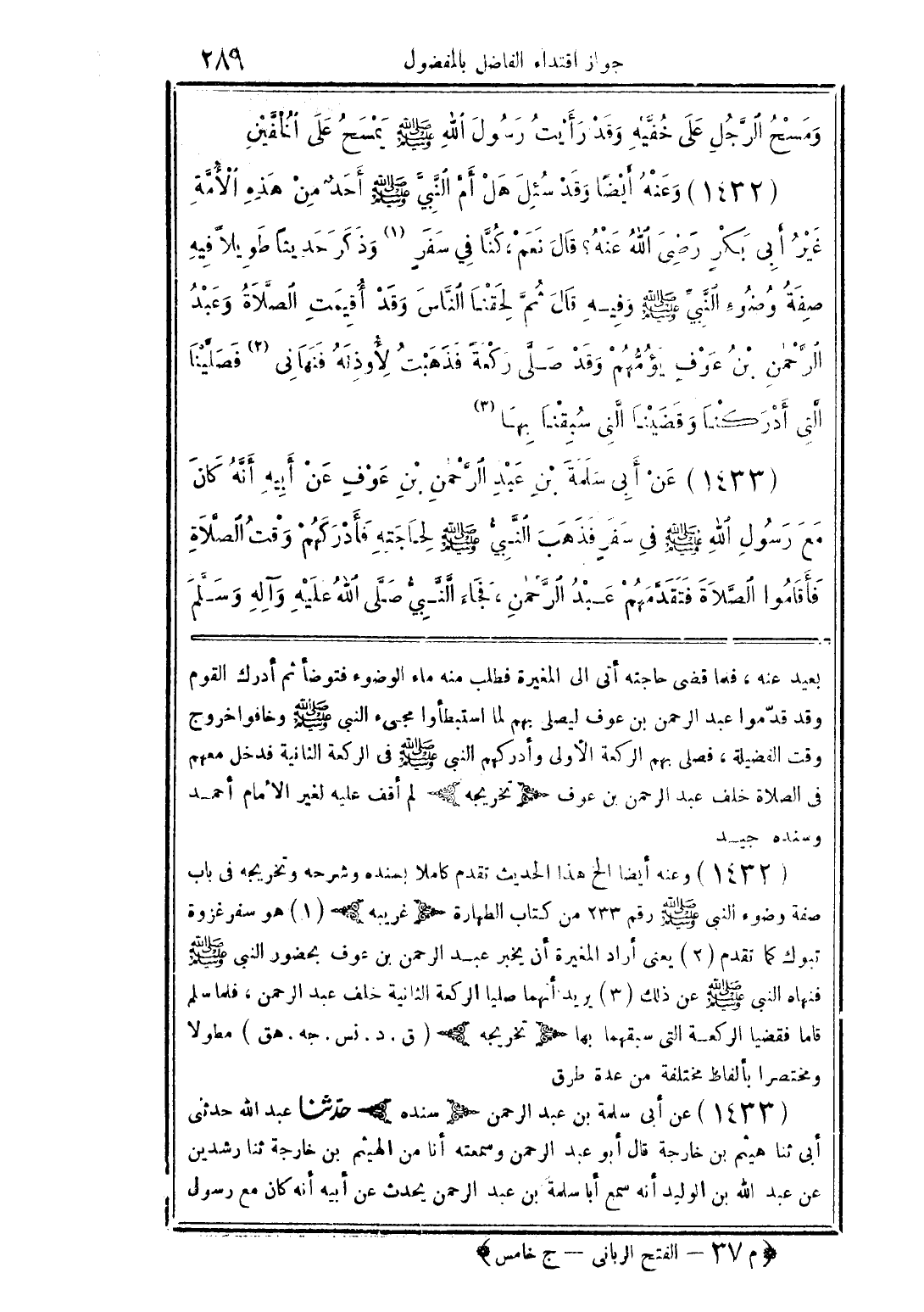 (1433) عن ابى سلمة بن عبد الرَّحمن بن عوفٍ عن أبيه أنَّه كان مع رسول الله صلى الله عليه وسلم فى سفرٍ فذهب النَّبيُّ صلى الله عليه وسلم لحاجته فأدركهم وقت الصلَّاة فأقاموا الصَّلاة فتقدَّمهم عبد الرَّحمن، فجاء الَّنَّبيُّ صلَّى الله عليه وآله وسلَّم