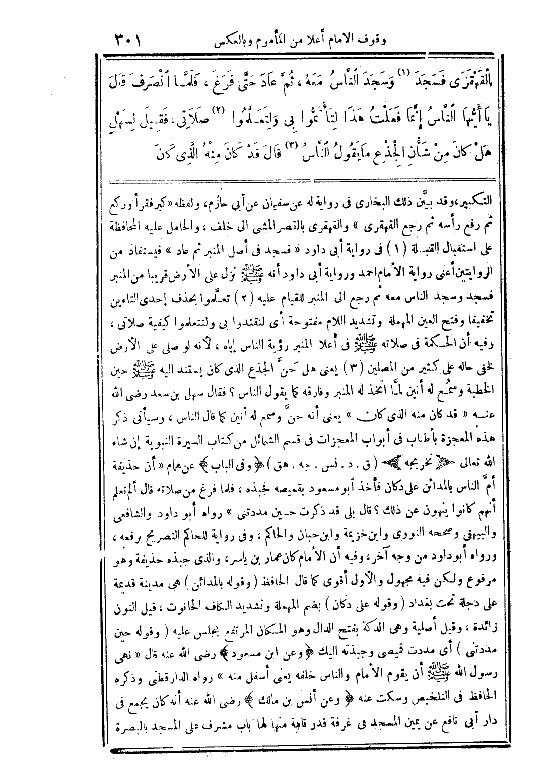 التكبير، وقد بيَّن ذلك البخارى في رواية له عن سفيان عن أبى حازم، ولفظه "كبر فقرأ وركع ثم رفع رأسه ثم رجع القهقرى" والقهقرى بالقصر المشى إلى خلف، والحامل عليه المحافظة على استقبال القبلة (1) في رواية أبى داود "فسجد في أصل المنبر ثم عاد" فستقاد من الروايتين أعنى رواية الأمام احمد ورواية أبى داود أن صلى الله عليه وسلم نزل على الأرض قريبا من المنبر فسجد وسجد الناس معه ثم رجع إلى المنبر للقيام عليه (2) تعلمَّوا بحذف إحدى التاءين تخفيفا وفتح العين المهملة وتشديد اللام مفتوحة أي لتقتدوا بى ولتتعلموا كيفية صلاتى، وفيه أن الحكمة في صلاته صلى الله عليه وسلم في أعلا المنبر رؤية الناس غياه، لأنه لو صلى على الأرض لخفى حاله على كثير من المصلين (3) يعنى هل حَنَّ الجذع الذي كان يستند إليه صلى الله عليه وسلم حين الخطبة وسُمع له أنين لمَّا اتخذ له المنبر وفارقه كما يقول الناس؟ فقال سهل بن سعد رضي الله عنه "قد كان منه الذي كان" يعنى أنه حنَّ وسمع له أنين كما قال الناس، وسيأتى ذكر هذه المعجزة بأطناب في أبواب المعجزات في قسم الشمائل من كتاب السيرة النبوية إن شاء الله تعالى (تخريجه) (ق. د. نس. جه. هق) (وفي الباب) عن همام "أن حذيفة أمَّ الناس بالمدائن على دكان فأخذ أبو مسعود بقميصه فجبذه، فلما فرغ من صلاته قال ألم تعلم أنهم كانوا ينهون عن ذلك؟ قال بلى قد ذكرت حين مددتنى" رواه أبو داود والشافعى والبيهقى وصححه النووى وابن خزيمة وابن حبان والحاكم، وفي رواية للحاكم التصريح برفعه، ورواه أبو داود من وجه آخر، وفيه أن الأمام كان عمار بن ياسر، والذى جبذه حذيفة وهو مرفوع ولكن فيه مجهول والأول أقوى كما قال الحافز (وقوله بالمدائن) هى مدينة قديمة على دجلة تحت بغداد (وقوله على دكان) بضم المهملة وتشديد الكاف الحانوت، قيل النون زائدة، وقيل أصلية وهى الدكة بفتح الدال وهو المكان المرتفع يجلس عليه (وقوله حين مددتى) أي مددت قميصى وجبذته اليك (وعن ابن مسعود) رضي الله عنه قال "نهى رسول الله صلى الله عليه وسلم أن يقوم الأمام والناس خلفه يعنى أسفل منه" رواه الدارقطنى وذكره الحافظ في التلخيص وسكت عنه (وعن أنس بن مالك) رضي الله عنه أنه كان يجمع في دار أبى نافع عن يمين المسجد في غرفة قد قامة منها لها باب مشرف على المسجد بالبصرة