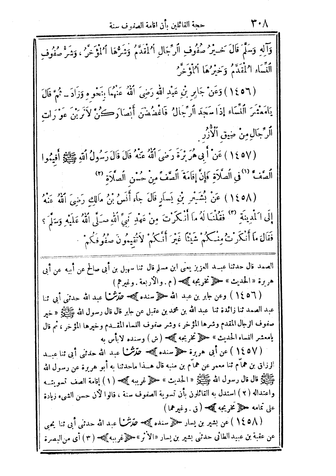وآله وسلَّم قال خير صفوف الرِّجال المقدَّم وشرُّها المؤخرَّ، وشرُّ صفوف النِّساء المقدَّم وخيرها المؤخرَّ