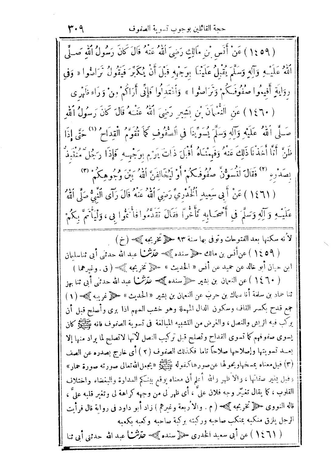 (1459) عن أنس بن مالكٍ رضى الله عنه قال كان رسول الله صلَّى الله عليه وآله وسلَّم يقبل علينا بوجهه قبل أن يكبِّر فيقول تراصُّوا "وفى روايةٍ أقيموا صفوفكم وتراصُّوا" وأهتدوا فإنىِّ أراكم من وراء ظهرى