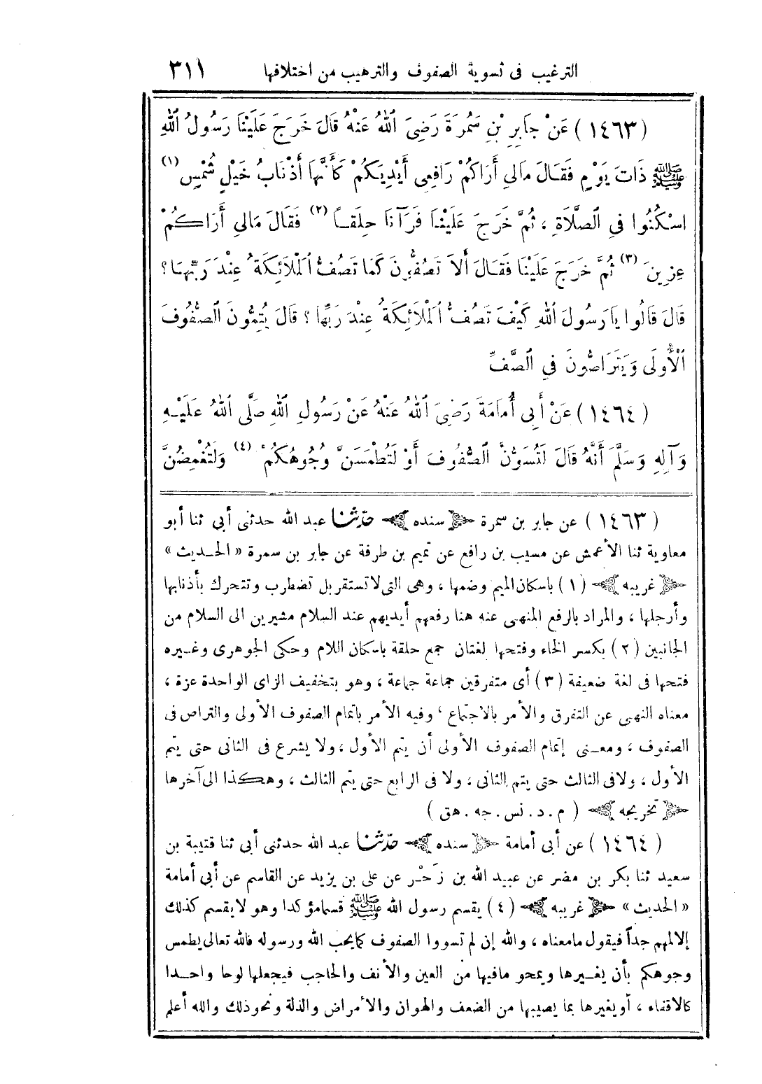 (1463) عن جابر بن سمرة (سنده) حدّثنا عبد الله حدثنى أبى ثنا أبو معاوية ثنا الأعمش عن مسيب بن رافع عن تميم بن طرفة عن جابر بن سمرة "الحديث" (غريبه) (1) باسكان الميم وضمها، وهى التي لا تستقر بل تضطرب وتتحرك بأذنابها وأرجلها، والمراد بالرفع المنهى عنه هنا رفعهم ايديهم عند السلام مشيرين إلى السلام من الجانبين (2) بكسر الخاء وفتحها لغتان جمع حلقة باسكان اللام وحكى الجوهرى وغيره فتحها في لغة ضعيفة (3) أي متفرقين جماعة جماعة، وهو بتخفيف الزاى الواحدة عزة، معناه النهى عن التفرق والأمر بالاجتماع، وفيه الأمر باتمام الصفوف الأولى والتراص في الصفوف، ومعنى إتمام الصفوف الأولى أن يتم الأول، ولا يشرع في الثانى حتى يتم الأول، ولا في الثالث حتى يتم الثانى، ولا في الرابع حتى يتم الثالث، وهكذا إلى آخرها (تخريجه) (م. د. نس. جه. هق).
