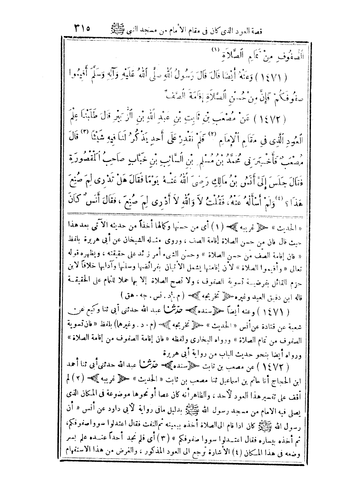 (1472) عن مصعب بن ثابت (سنده) حدّثنا عبد الله حدثنى أبى ثنا أحمد ابن الحجاج أنا حاتم بن اسماعيل ثنا مصعب بن ثابت "الحديث" (غريبه) (2) لم أقف على تفسير هذا العود لأحد، والظاهر أنه كان عصا أو نحوها موضوعة في المكان الذي يصلى فيه الامام من مسجد رسول الله صلى الله عليه وسلم بدليل ما في رواية لأبى داود عن أنس "أن رسول الله صلى الله عليه وسلم كان اذا قام إلى الصلاة أخذه بيمينه ثم التفت فقال اعتدلوا سووا صفوفكم، ثم أخذه بيساره فقال اعتدلوا سووا صفوفكم" (3) أي فلم نجد أحداً عنده علم بسر وضعه في هذا المكان (4) الأشارة ترجع إلى العود المذكور، والغرض من هذا الاستفهام