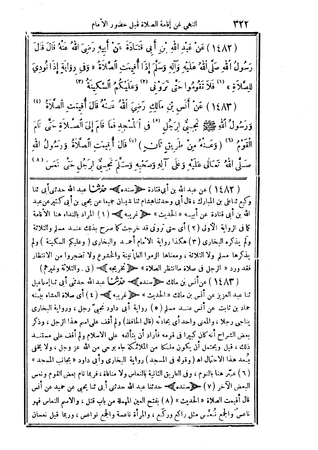 (1482) عن عبد الله بن أبى قتادة عن أبيه رضى الله عنه قال قال رسول الله صلَّى الله عليه وآله وسلَّم إذا أقيمت الصَّلاة "وفى روايةٍ إذا نودي للصَّلاة" فلا تقوموا حتَّى ترونى وعليكم السَّكينة
