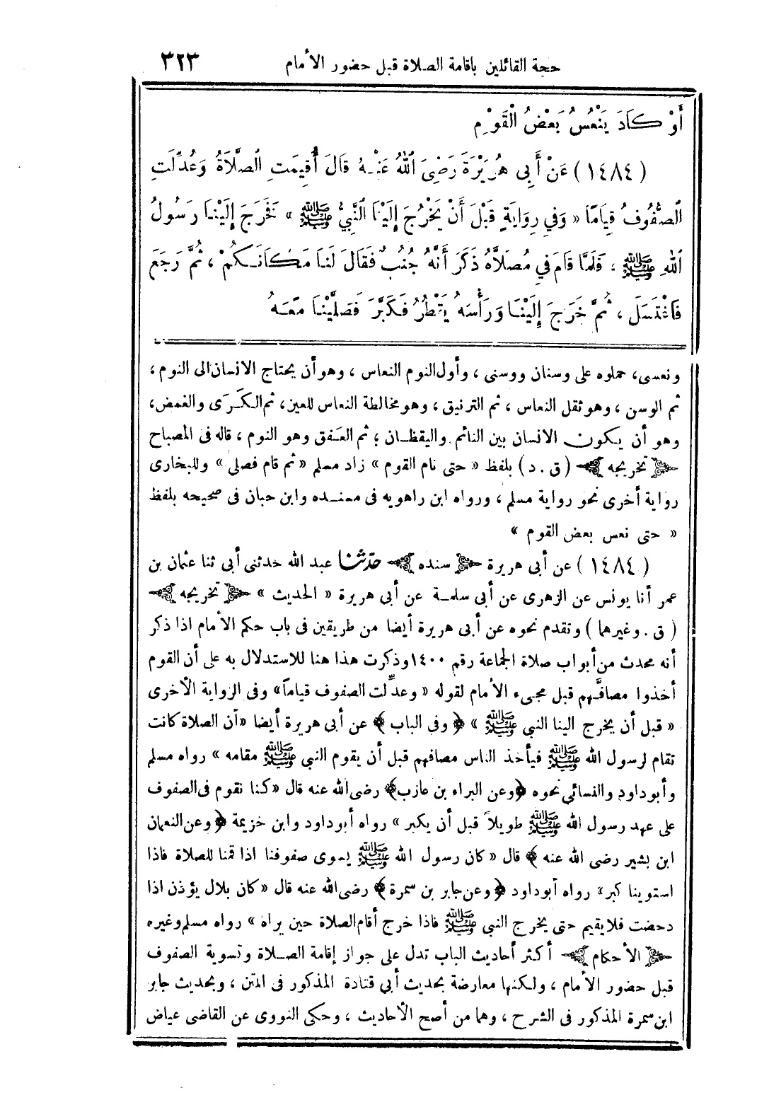 (1484) عن أبى هريرة (سنده) حدّثنا عبد الله حدثنى ابى ثنا عثمان بن عمر أنا يونس عن الزهرى عن أبى سلمة عن أبى هريرة "الحديث" (تخريجه) (ق. وغيرهما) وتقدم نحوه عن أبى هريرة أيضا من طريقين في باب حكم الأمام اذا ذكر أنه محدث من أبواب صلاة الجماعة رقم 1400 وذكرت هذا هنا للاستدلال به على أن القوم أخذوا مضافَّهم قبل مجئ الأمام لقوله "وعدِّلت الصفوف قياماً" وفي الرواية الأخرى "قبل أن يخرج الينا النبي صلى الله عليه وسلم" (وفي الباب) عن أبى هريرة أيضا "أن الصلاة كانت تقام لرسول الله صلى الله عليه وسلم فيأخذ الناس مصافهم قبل أن يقوم النبي صلى الله عليه وسلم مقامه" رواه مسلم وأبو داود والنسائى نحوه (وعن البراء بن عازب) رضي الله عنه قال "كنا نقوم في الصفوف على عهد رسول الله صلى الله عليه وسلم طويلاً قبل أن يكبر" رواه أبو داود وابن خزيمة (وعن النعمان ابن بشير رضي الله عنه) قال "كان رسول الله صلى الله عليه وسلم يسوى صفوفنا اذا قمنا للصلاة فاذا استوينا كبر" رواه أبو داود (وعن جابر بن سمرة) رضي الله عن قال "كان بلال يؤذن اذا دحضت فلا يقيم حتى يخرج النبي صلى الله عليه وسلم فاذا خرج أقام الصلاة حين يراه" رواه مسلم وغيره (الأحكام) أكثر أحاديث الباب تدل على جواز إقامة الصلاة وتسوية الصفوف قبل حضور الأمام، ولكنها معارضة بحديث أبى قتادة المذكور في المتن، وبحديث جابر ابن سمرة المذكور في الشرح، وهما من أصح الأحاديث، وحكى النووي عن القاضي عياض