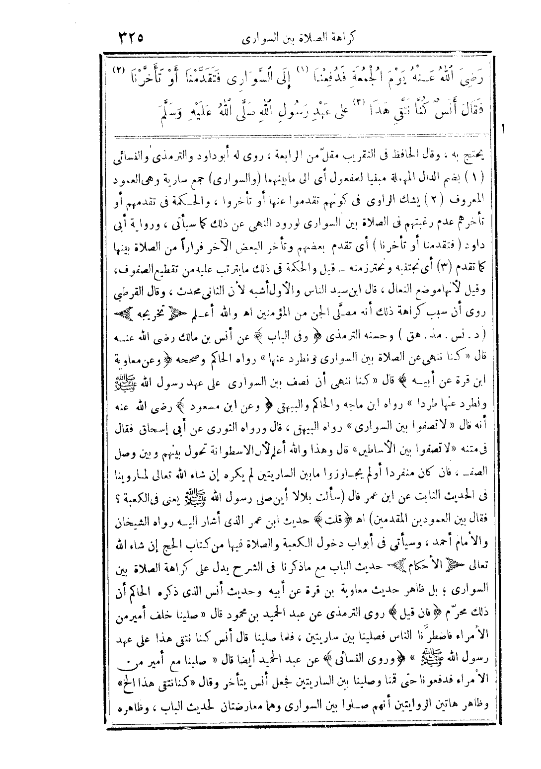 يحتج به، وقال الحافظ في التقريب مقلّ من الرابعة، روى له أبو داود والترمذى والنسائى (1) بضم الدال المهملة مبنيا لمفعول أي إلى ما بينهما (والسوارى) جمع سارية وهى العمود المعروف (2) يشك الرواى في كونهم تقدموا عنها أو تأخروا، والحكمة في تقدمهم أو تأخرهم عدم رغبتهم في الصلاة بين السوارى لورود النهى عن ذلك كما سيأتى، ورواية أبى داود (فتقدمنا أو تأخرنا) أي تقدم بعضهم وتأخر البعض الآخر فراراً من الصلاة بينها كما تقدم (3) أي نجتنبه ونحترز منه - قيل والحكمة في ذلك ما يترتب عليه من تقطيع الصفوف، وقيل لأنها موضع النعال، قال ابن سيد الناس والأول أشبه لأن الثانى محدث، وقال القرطبى روى أن سبب كراهة ذلك أنه مصلَّى الجن من المؤمنين اهـ والله أعلم (تخريجه) (د. نس. مذ. هق) وحسنه الترمذى (وفي الباب) عن أنس بن مالك رضي الله عنه قال "كنا ننهى عن الصلاة بين السوارى ونطرد عنها" رواه الحاكم وصححه (وعن معاوية ابن قرة عن أبيه) قال "كنا ننهى أن نصف بين السوارى على عهد رسول الله صلى الله عليه وسلم ونطرد عنها طردا" رواه ابن ماجة والحاكم والبيهقى (وعن ابن مسعود) رضي الله عنه أنه قال "لا تصفوا بين السوارى" رواه البيهقى، قال ورواه الثورى عن أبى إسحاق فقال في متنه "لا تصفوا بين الأساطين" قال وهذا والله أعلم لأن الاسطوانة تحول بينهم وبين وصل الصف، فان كان منفردا أو لم يجاوزوا ما بين الساريتين لم يكره إن شاء الله تعالى لما روينا في الحديث الثابت عن ابن عمر قال (سألت بلالا أين صلى رسول الله صلى الله عليه وسلم يعنى في الكعبة؟ فقال بين العمودين المقدمين) اهـ (قلت) حديث ابن عمر الذي أشار اليه رواه الشيخان والأمام أحمد، وسيأتى في أبواب دخول الكعبة والصلاة فيها من كتاب الحج إن شاء الله تعالى (الأحكام) حديث الباب مع ما ذكرنا في الشرح يدل على كراهة الصلاة بين السوارى؛ بل ظاهر حديث معاوية بن قرة عن أبيه وحديث أنس الذي ذكره الحاكم أن ذلك محرّم (فان قيل) روى الترمذى عن عبد الحميد بن محمود قال "صلينا خلف أمير من الأمراء فاضطرَّنا الناس فصلينا بين ساريتين، فلما صلينا قال أنس كنا نتقى هذا على عهد رسول الله صلى الله عليه وسلم" (وروى النسائى) عن عبد الحميد أيضا قال "صلينا مع أمير من الأمراء فدفعونا حتى قمنا وصلينا بين الساريتين فجعل أنس يتأخر وقال "كنا نتقى هذا الخ" وظاهر هاتين الروايتين أنهم صلوا بين السوارى وهما معارضتان لحديث الباب، وظاهره