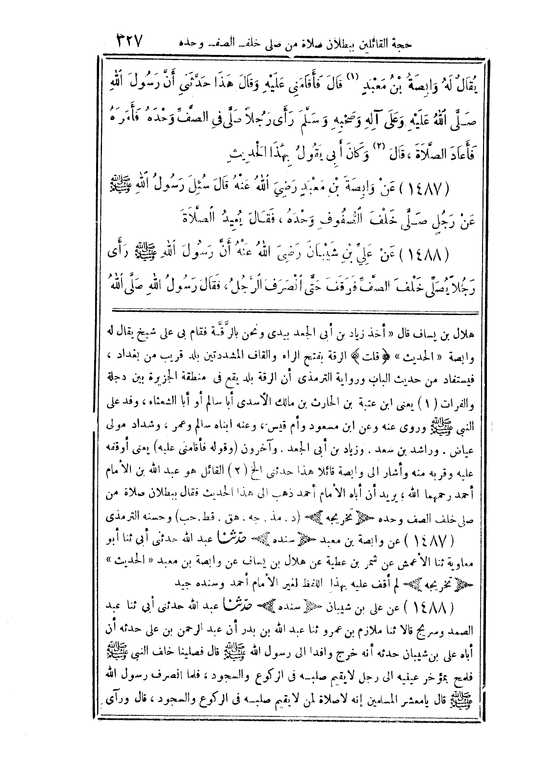 هلال بن يساف قال "أخذ زياد بن أبى الجعد بيدى ونحن بالرّقّة فقام بى على شيخ يقال له وابصة "الحديث" (قلت) الرقة بفتح الراء والقاف المشددتين بلد قريب من بغداد، فيستفاد من حديث الباب ورواية الترمذى أن الرقة بلد يقع في منطقة الجزيرة بين دجلة والفرات (1) يعنى ابن عتبة بن الحارث بن مالك الأسدى أبا سالم أو أبا الشعثاء، وفد على النبي صلى الله عليه وسلم وروى عنه وعن ابن مسعود وأم قيس، وعنه ابناه سالم وعمر، وشداد مولى عباض. وراشد بن سعد. وزياد بن ابى الجعد. وآخرون (وقوله فأقامنى عليه) يعنى أوقفه عليه وقربه منه وأشار إلى وابصة قائلا هذا حدثنى الخ (2) القائل هو عبد الله بن الأمام أحمد رحمهما الله، يريد أن اباه الأمام أحمد ذهب إلى هذا الحديث فقال ببطلان صلاة من صلى خلف الصف وحده (تخريجه) (د. مذ. جه. هق. قط. حب) وحسنه الترمذى.