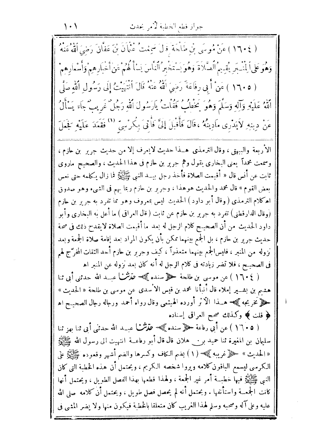 (1605) عن أبى رفاعة {سنده} حدثنا عبد الله حدثنى أبى ثنا بهز ثنا سليمان بن المغيرة ثنا حميد بن هلال قال قال أبو رفاعة انتهيت الى رسول الله صلى الله عليه وسلم "الحديث" {غريبه} (1) بضم الكاف وكسرها والضم أشهر وقعوده صلى الله عليه وسلم على الكرسى ليسمع الباقون كلامه ويروا شخصه الكريم، ويحتمل أن هذه الخطبة التي كان النبى صلى الله عليه وسلم فيها خطبة أمر غير الجمعة، ولهذا قطعها بهذا الفصل الطويل، ويحتمل أنها كانت الجمعة واستأنفها. ويحتمل أنه لم يحصل فصل طويل، ويحتمل أن كلامه صلى الله عليه وعلى آله وصحبه وسلم لهذا الغريب كان متعلقاً بالخطبة فيكون منها ولا يضر المشي في