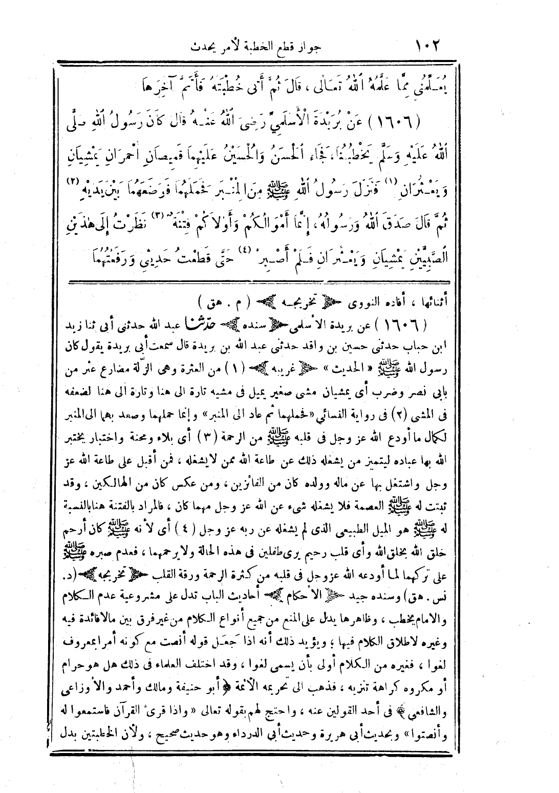(1606) عن بريدة الأسلميِّ رضى الله عنه قال كان رسول الله صلى الله عليه وسلَّم يخطبنا، فجاء الحسن والحسين عليهما قميصان أحمران يمشيان ويعثران (1) فنزل رسول الله (صلى الله عليه وسلم) من المنبر فحملهما فوضعهما بين يديه (2) ثمَّ قال صدق الله ورسوله، إنَّما أموالكم وأولادكم فتنةٌ (3) نظرت إلى هذين الصَّبيين يمشيان ويعثران فلم أصبر (4) حتَّى قطعت حديثي ورفعتهما