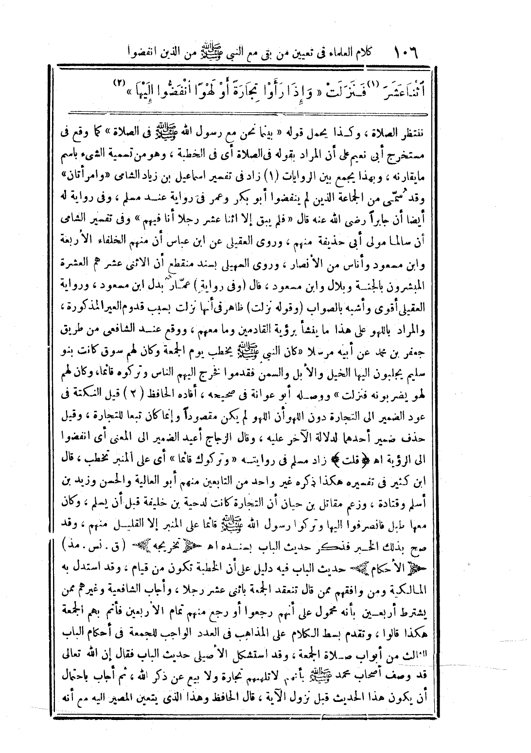 ننتظر الصلاة، وكذا يحمل قوله "بينما نحن مع رسول الله صلى الله عليه وسلم فى الصلاة" كما وقع فى مستخرج أبى نعيم على أن المراد بقوله فى الصلاة أى فى الخطبة، وهو من تسمية الشيء باسم ما يقارنه، وبهذا يجمع بين الروايات (1) زاد فى تفسير اسماعيل بن زياد الشامى "وامرأتان" وقد سُمّى من الجماعة الذين لم ينفضوا أبو بكر وعمر فى رواية عند مسلم، وفى رواية له أيضاً أن جابراً رضى الله عنه قال "فلم يبق إلا اثنا عشر رجلاً أنا فيهم" وفى تفسير الشامى أن سالماً مولى أبى حذيفة منهم، وروى العقيلى عن ابن عباس أن منهم الخلفاء الأربعة وابن مسعود وأناس من الأنصار، وروى السهيلى بسند منقطع أن الاثنى عشر هم العشرة المبشرون بالجنة وبلال وابن مسعود، قال (وفى رواية) عمّارٌ بدل ابن مسعود، ورواية العقيلى أقوى وأشبه بالصواب (وقوله نزلت) ظاهر فى أنها نزلت بسبب قدوم العير المذكورة، والمراد باللهو على هذا ما ينشأ برؤية القادمين وما معهم، ووقع عند الشافعى من طريق جعفر بن محمد عن أبيه مرسلاً "كان النبى صلى الله عليه وسلم يخطب يوم الجمعة وكان لهم سوق كانت بنو سليم يجلبون إليها الخيل والأبل والسمن فقدموا فخرج اليهم الناس وتركوه قائماً، وكان لهم لهو يضربونه فنزلت" ووصله أبو عوانة فى صحيحه، أفاده الحافظ (2) قيل النكتة فى عود الضمير الى التجارة دون اللهو أن اللهو لم يكن مقصوراً وإنما كان تبعاً للتجارة، وقيل حذف ضمير أحدهما لدلالة الآخر عليه، وقال الزجاج أعيد الضمير إلى المعنى أى انفضوا الى الرؤية اهـ {قلت} زاد مسلم فى روايته "وتركوك قائماً" أى على المنبر تخطب، قال ابن كثير فى تفسيره هكذا ذكره غير واحد من التابعين منهم أبو العالية والحسن وزيد بن أسلم وقتادة، وزعم مقاتل بن حيان أن التجارة كانت لدحية بن خليفة قبل أن يسلم، وكان معها طبل فانصروا اليها وتركوا رسول الله صلى الله عليه وسلم قائماً على المنبر إلا القليل منه، وقد صح بذلك الخبر فذكر حديث الباب بسنده اهـ {تخريجه} (ق. نس. مذ) {الأحكام} حديث الباب فيه دليل على أن الخطبة تكون من قيام، وقد استدل به المالكية ومن وافقهم ممن قال تنعقد الجمة باثنى عشر رجلاً، وأجاب الشافعية وغيرهم ممن يشترط أربعين بأنه محمول على أنهم رجعوا أو رجع منهم تمام الأربعين فأتم بهم الجمعة هكذا قالوا، وتقدم بسط الكلام على المذاهب فى العدد الواجب للجمعة فى أحكام الباب الثالث من أبواب صلاة الجمعة، وقد استشكل الأصلى حديث الباب فقال إن الله تعالى قد وصف أصحاب محمد صلى الله عليه وسلم بأنهم لا تلههم تجارة ولا بيع عن ذكر الله، ثم أجاب باحتمال أن يكون هذا الحديث قبل نزول الآية، قال الحافظ وهذا الذى يتعين المصير اليه مع أنه