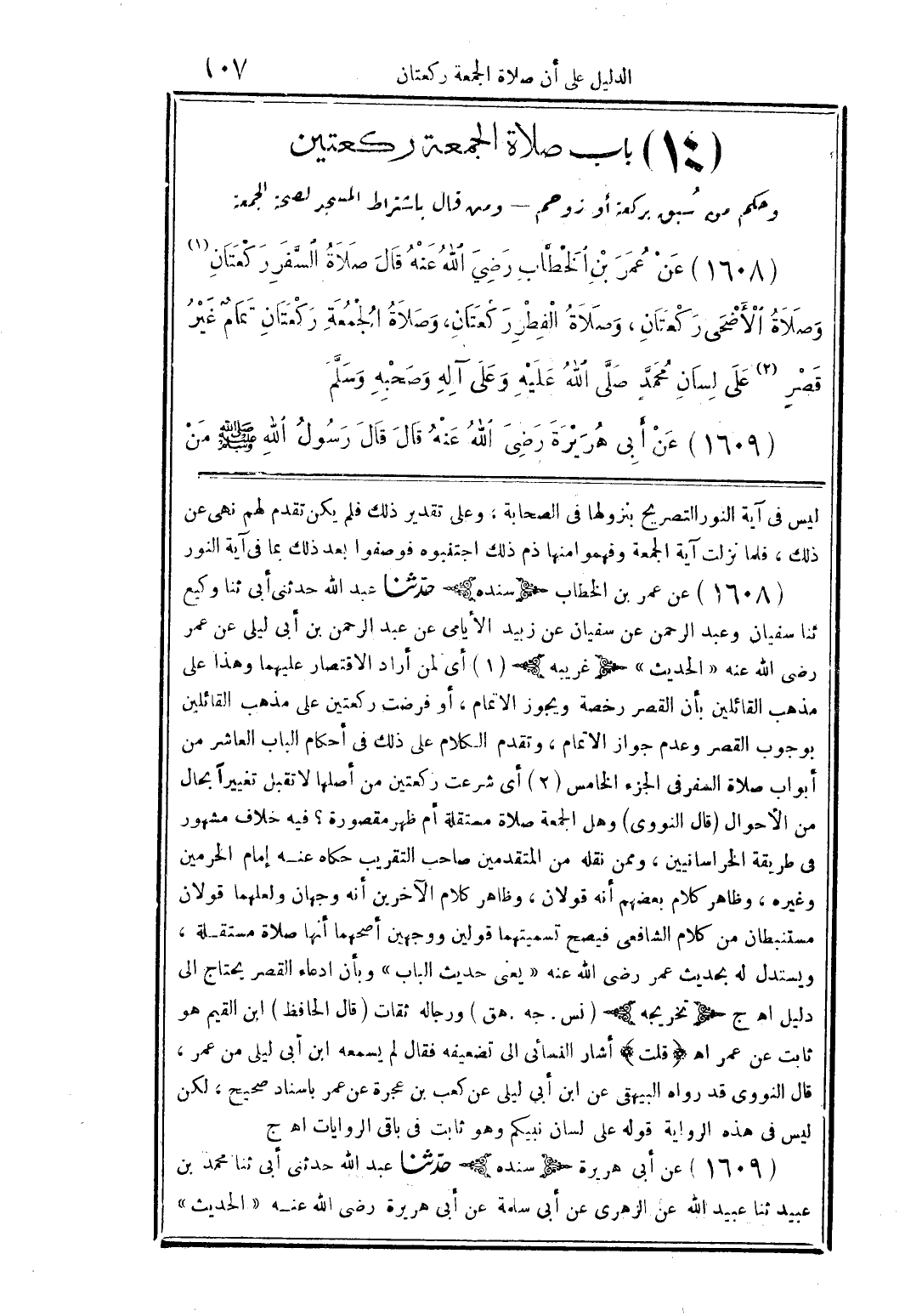 (1608 (ع عمر بن الخطَّاب رضي الله عنه قال صلاة السَّفر ركعتان (1) وصلاة الأضحى ركعتان، وصلاة الفطر ركعتان، وصلاة الجمعة ركعتان تمامٌ غير قصرٍ (2) على لسان محمدَّ صلَّى الله عليه وعلى آله وصحبه وسلَّم