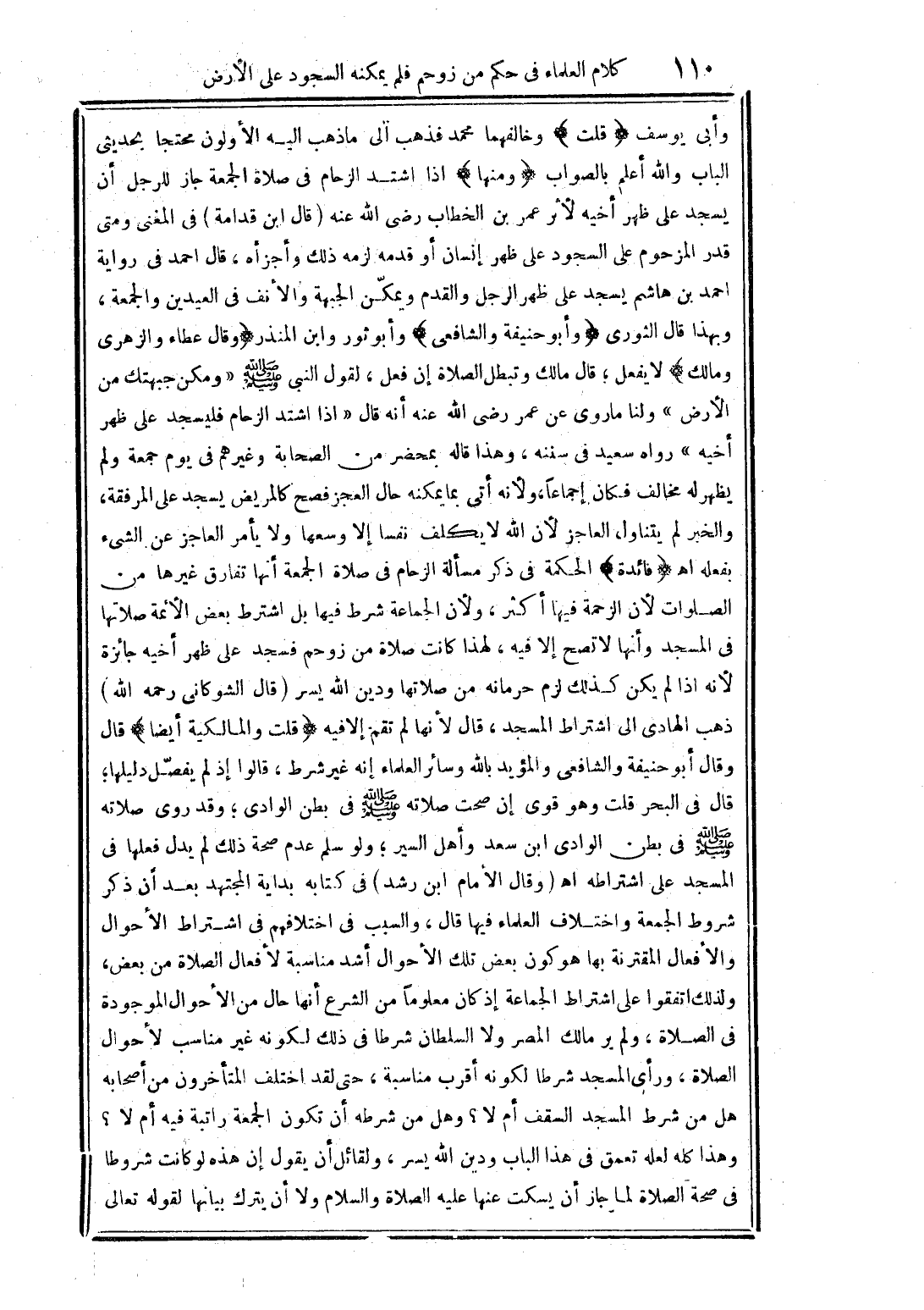 وأبي يوسف {قلت} وخالفهما محمد فذهب الى ما ذهب اليه الأولون محتجاً بحديثى الباب والله أعلم بالصواب {ومنها} اذا اشتد الزحام فى صلاة الجمعة جاز للرجل أن يسجد على ظهر أخيه لأثر عمر بن الخطاب رضى الله عنه (قال ابن قدامة) فى المغنى ومتى قدر المزحوم على السجود على ظهر إنسان أو قدمه لزمه ذلك وأجزأه، قال احمد فى رواية أحمد بن هاشم يسجد على ظهر الرجل والقدم ويمكّن الجبهة والأنف فى العيدين والجمعة، وبهذا قال الثورى {وأبو حنيفة والشافعى} وأبو ثور وابن المنذر {وقال عطاء والزهرى ومالك} لا يفعل؛ قال مالك وتبطل الصلاة إن فعل، لقول النبى صلى الله عليه وسلم "ومكن جبهتك من الأرض" ولنا ما روى عن عمر رضى الله عنه أنه قال "اذا اشتد الزحام فليسجد على ظهر يظهر له مخالف فكان إجماعاً، ولأنه أتى بما يمكنه حال العجز فصح كالمريض يسجد على المرفقة، والخبر لم يتناول العاجز لأن الله لا يكلف نفساً إلا وسعها ولا يأمر العاجز عن الشيء بفعله اهـ {فائدة} الحكمة فى ذكر مسألة الزحام فى صلاة الجمعة أنها تفارق غيرها من الصلوات لأن الزحمة فيها أكثر، ولأن الجماعة شرط فيها بل اشترط بعض الأئمة صلاتها فى المسجد وأنها لا تصح إلا فيه، لهذا كانت صلاة من زوحم فسجد على ظهر أخيه جائزة لأنه اذا لم يكن كذلك لزم حرمانه من صلاتها ودين الله يسر (قال الشوكانى رحمه الله) ذهب الهادى الى اشتراط المسجد، قال لأنها لم تقم إلا فيه {قلت والمالكية أيضاً} قال وقال أبو حنيفة والشافعى والمؤيد بالله وسائر العلماء إنه غير شرط، قالوا إذ لم يفصّل دليلها؛ قال فى البحر قلت وهو قوى إن صحت صلاته صلى الله عليه وسلم فى بطن الوادى؛ وقد روى صلاته صلى الله عليه وسلم فى بطن الوادى ابن سعد وأهل السير؛ ولو سلم عدم صحة ذلك لم يدل فعلها فى المسجد على اشتراطه اهـ (وقال الأمام ابن رشد) فى كتابه بداية المجتهد بعد أن ذكر شروط الجمعة واختلاف العلماء فيها قال، والسبب فى اختلافهم فى اشتراط الأحوال والأفعال المقترنة بها هو كون بعض تلك الأحوال أشد مناسبة لأفعال الصلاة من بعض، ولذلك اتفقوا على اشتراط الجماعة إذ كان معلوماً من الشرع أنها حال من الأحوال الموجودة فى الصلاة، ورأى المسجد شرطاً لكونه أقرب مناسبة، حتى لقد اختلف المتأخرون من أصحابه هل من شرط المسجد السقف أم لا؟ وهل من شرطه أن تكون الجمعة راتبة فيه أم لا؟ وهذا كله لعله تعمق فى هذا الباب ودين الله يسر، ولقائل أن يقول إن هذه لو كانت شروطاً فى صحة الصلاة لما جاز أن يسكت عنها عليه الصلاة والسلام ولا أن يترك بيانها لقوله تعالى