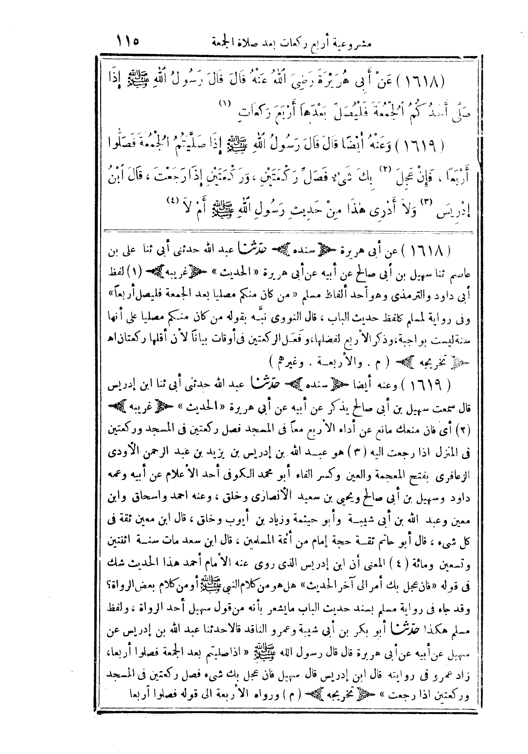 (1619) وعنه أيضًا قال قال رسول الله (صلى الله عليه وسلم) إذا صلَّيتم الجمعة فصلَّوا أربعًا، فإن عجل (2) بك شيءٌ فصلِّ ركعتين، وركعتين إذا رجعت، قال ابن إدريس (3) ولا أدرى هذا من حديث رسول الله (صلى الله عليه وسلم) أم لا (4)