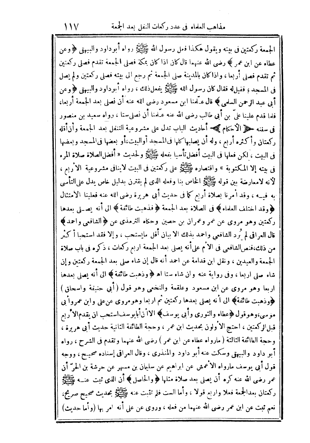 الجمعة ركعتين فى بيته ويقول هكذا فعل رسول الله صلى الله عليه وسلم رواه أبو داود والبيهقى {وعن عطاء ابن عمر} رضى الله عنهما قال كان اذا كان بمكة فصلى الجمعة تقدم فصلى ركعتين ثم تقدم فصلى أربعاً، واذا كان بالمدينة صلى الجمعة ثم رجع الى بيته فصلى ركعتين ولم يصل فى المسجد؛ فقيل له فقال كان رسول الله صلى الله عليه وسلم يفعل ذلك، رواه أبو داود والبيهقى {وعن أبى عبد الرحمن السلمى} قال علّمنا ابن مسعود رضى الله عنه أن نصلى بعد الجمعة أربعاً، فلماذا قدم علينا علىّ بن أبى طالب رضى الله عنه علّمنا أن نصلى ستاً، رواه سعيد بن منصور فى سننه {الأحكام} أحاديث الباب تدل على مشروعية التنقل بعد الجمعة وأن أقله ركعتان وأكثره أربع، وله أن يصليها كلها فى المسجد أو البيت، أو بعضها فى المسجد وبعضها فى البيت، ولكن فعلها فى البيت أفضل تأسياً بفعله صلى الله عليه وسلم ولحديث "أفضل الصلاة صلاة المرء فى بيته إلا المكتوبة" واقتصاره صلى الله عليه وسلم على ركعتين فى البيت لا ينافى مشروعية الأربع، لأنه لا معارضة بين قوله صلى الله عليه وسلم الخاص بنا وفعله الذى لم يقترن بدليل خاص يدل على التأسى به فيه، وقد أمرنا بصلاة أربع كما فى حديث أبى هريرة رضى الله عنه فعلينا الامتثال {وقد اختلف العلماء} فى الصلاة بعد الجمعة {فذهبت طائفة} إلى أنه يصلى بعدها ركعتين وهو مروى عن عمر وعمران بن حصين وحكاه الترمذى عن {الشافعى واحمد} قال العراقى لم يُرد الشافعى واحمد بذلك الا بيان أقل ما يستحب، وإلا فقد استحبا أكثر من ذلك، فنص الشافعى فى الأم على أنه يصلى بعد الجمعة أربع ركعات، ذكره فى باب صلاة الجمعة والعيدين، ونقل ابن قدامة عن احمد أنه قال إن شاء صلى بعد الجمعة ركعتين وإن شاء صلى أربعاً، وفى رواية عنه وإن شاء ستاً اهـ {وذهبت طائفة} الى أنه يصلى بعدها أربعاًوهو مروى عن ابن مسعود وعلقمة والنخعى وهو قول (أبى حنيفة وإسحاق) {وذهبت طائفة} الى أنه يصلى بعدها ركعتين ثم أربعاً وهو مروى عن على وابن عمرو أبى موسى، وهو قول {عطاء والثورى وأبى يوسف} الا أنه أبا يوسف استحب أن يقدم الأربع قبل الركعتين، احتج الأولون بحديث ابن عمر، وحجة الطائفة الثانية حديث أبى هريرة، وحجة الطائفة الثالثة (ما رواه عطاء عن ابن عمر) رضى الله عنهما وتقدم فى الشرح، رواه أبو داود والبيهقى وسكت عنه أبو داود والمنذرى، وقال العراقى إسناده صحيح، ووجه قول أبى يوسف ما رواه الأعمش عن إبراهيم عن سليمان بن مسهر عن حرشة بن الحرّ أن عمر رضى الله عنه كره أن يصلى بعد صلاة مثلها {والحاصل} أن الذى ثبت عنه صلى الله عليه وسلم ركعتان بعد الجمعة فعلاً وأربع قولاً، وأما الست فلم تثبت عنه صلى الله عليه وسلم بحديث صحيح صريح، نعم ثبت عن ابن عمر رضى الله عنهما من فعله، ورى عن على أنه أمر بها (وأما حديث)