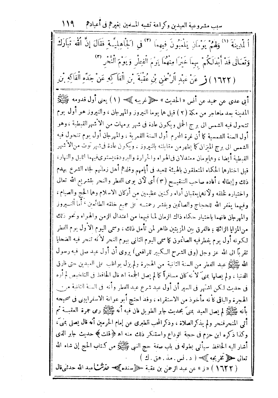 المدينة (1) ولهم يومان يلعبون فيهما (2) فى الجاهليَّة فقال إنَّ الله تبارك وتعالى قد أبدلكم بهما خيرًا منهما يوم الفطر ويوم النَّحر (3)