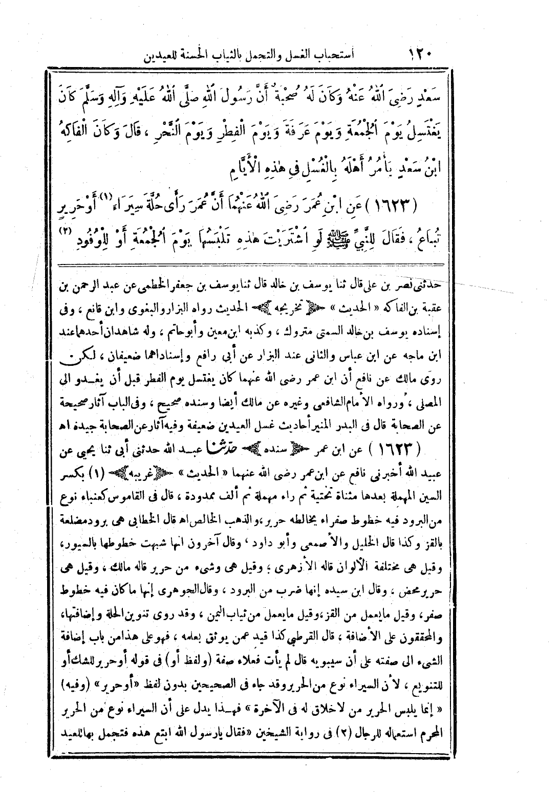 (1623) عن ابن عمر رضى الله عنهما أنَّ عمر رأى حلَّة سيراء (1) أو حريرٍ تباع، فقال للنَّبيِّ (صلى الله عليه وسلم) لو اشتريت هذه تلبسها يوم الجمعة أو للوفود (2)