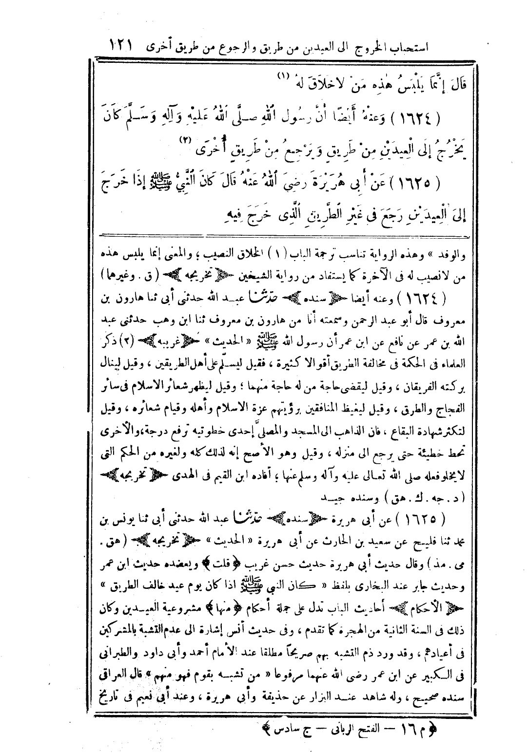(1624) وعنه أيضًا أنَّ رسول الله صلَّى الله عليه وآله وسلَّم كان يخرج إلى العيدين من طريق ويرجع من طريقٍ أخرى (2)