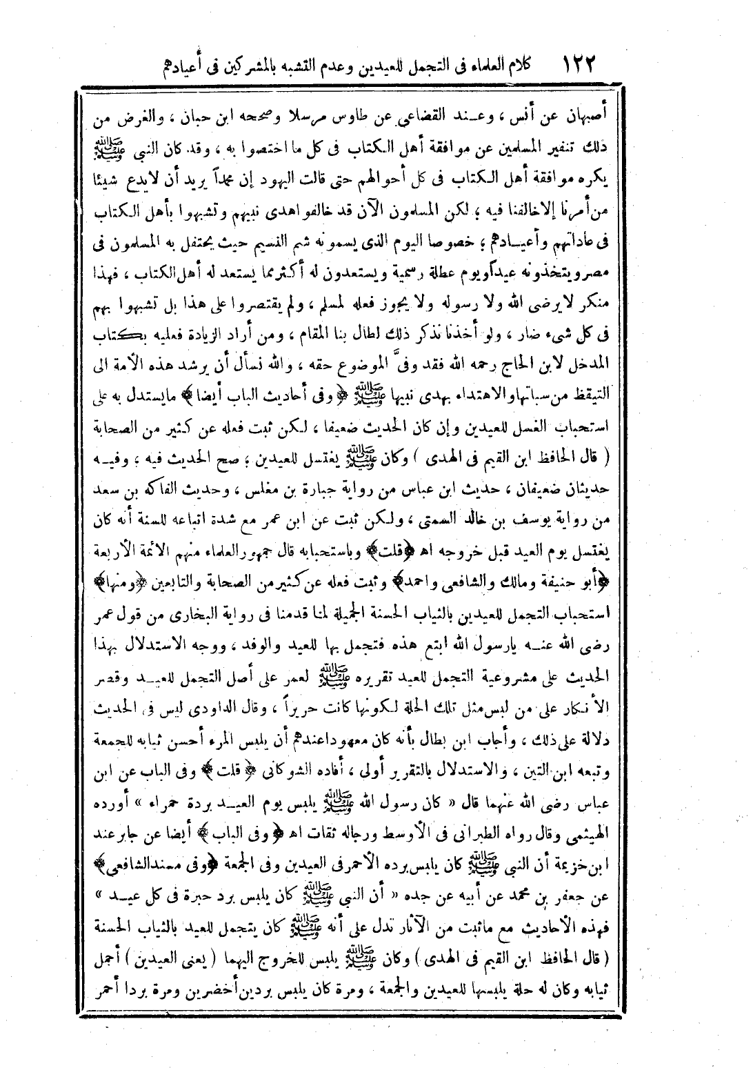 أصبهان عن أنس، وعند اللقضاعى عن طاوس مرسلاً وصححه ابن حبان، والغرض من ذلك تنفير المسلمين عن موافقة أهل الكتاب في كل ما اختصوا به، وقد كان النبى صلى الله عليه وسلم يكره موافقة أهل الكتاب في كل أحوالهم حتى قالت اليهود إن محمداً يريد أن لا يدع شيئاً من أمرنا إلا خالفنا فيه؛ لكن المسلمون الآن قد خالفوا هدى نبيهم وتشبهموا بأهل الكتاب في عاداتهم وأعيادهم؛ خصوصاً اليوم الذى يسمونه شم النسم حيث يحتفل به المسلمون في مصر ويتخذونه عيداً ويوم عطلة رسمية ويستعدون له أكثر مما يستعد له أهل الكتاب، فهذا منكر لا يرضى الله ولا رسوله ولا يجوز فعله لمسلم، ولم يقتصروا على هذا بل تشهبوا بهم في كل شيء ضار، ولو أخذنا نذكر ذلك لطال بنا المقام، ومن أراد الزيادة فعليه بكتاب المدخل لابن الحجاج رحمه الله فقد وفىَّ الموضوع حقه، والله نسأل أن يرشد هذه الأمة الى التيقظ من سباتها والاهتداء بهدى نبيها صلى الله عليه وسلم {وفي أحاديث الباب أيضاً} ماي ستدل به على استحباب الغسل للعيدين وإن كان الحديث ضعيفاً، لكن ثبت فعله عن كثير من الصحابة (قال الحافظ ابن القيم في الهدى) وكان صلى الله عليه وسلم يغتسل للعيدين؛ صح الحديث فيه؛ وفيه حديثان ضعيفان، حديث ابن عباس من رواية جبارة بن مغلس، وحديث الفاكه بن سعد من رواية يوسف بن خالد السمتى، ولكن ثبت عن ابن عمر مع شدة اتباعه للسنة أنه كان يغتسل يوم العيد قبل خروجه اهـ {قلت} وباستحبابه قال جمهور العلماء منهم الأئمة الأربعة {أبو حنيفة ومالك والشافعى واحمد} وثبت فعله عن كثير من الصحابة والتابعين {ومنها} استحباب التجمل للعديين بالثياب الحسنة الجميلة لما قدمنا من رواية البخارى من قول عمر رضى الله عنه يا رسول الله ابتع هذه فتجمل بها للعيد والوفد، ووجه الاستدلال بهذا الحديث على مشروعية التجمل للعيد تقريره صلى الله عليه وسلم لعمر على أصل التجمل للعيد وقصر الأنكار على من لبس مثل تلك الحلة لكونها كانت حريراً، وقال الداودى ليس في الحديث دلالة على ذلك، وأجاب ابن بطال بأنه كان معهوداً عندهم أن يلبس المرء أحسن ثيابه للجمعة وتبه ابن التين، والاستدلال بالتقرير أولى، أفاده الشوكانى {قلت} وفي الباب عن ابن عباس رضى الله عنهما قال "كان رسول الله صلى الله يلبس يوم العيد بردة حمراء" أورده الهيثمى وقال رواه الطبرانى في الأوسط ورجاله ثقات اهـ {وفي الباب} أيضاً عن جابر عند ابن خزيمة أن النبى صلى الله علهي وسلم كان يلبس برده الأحمر في العيدين وفي الجمعة {وفي مسند الشافعى} عن جعفر بن محمد عن أبيه عن جده "أن النبى صلى الله عليه وسلم كان يلبس برد حبرة في كل عيد" فهذه الأحاديث مع ما ثبت من الآثار تدل على أنه صلى الله عليه وسلم كان يتجمل للعيد بالثياب الحسنة (قال الحافظ ابن القيم في الهدى) وكان صلى الله عليه وسلم يلبس للخروج اليهما (يعنى العيدين) أجمل ثيابه وكان له حلة يلبسها للعيدين والجمعة، ومرة كان يلبس بردين أخضرين ومرة بردا أحمر