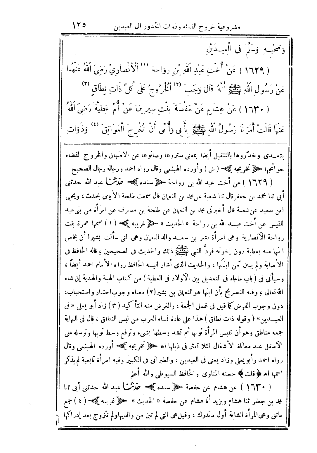 (1629) عن أخت عبد الله بن رواحة (1) الأنصاريَّ رضى الله عنهما عن رسول الله (صلى الله عليه وسلم) أنَّه قال وجب (2) الخروج على كلِّ ذات نطاقٍ (3)