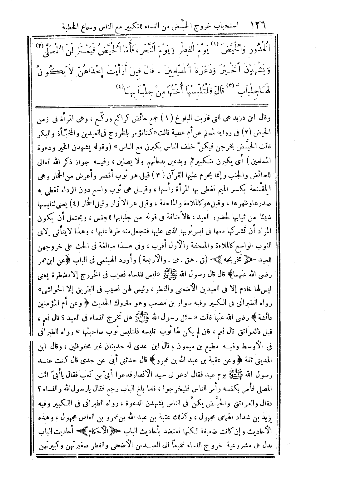 وقال ابن دريد هى التى قاربت البلوغ (1) جمع حائض كراكع وركّع، وهى المرأة في زمن الحيض (2) في رواية لمسلم عن أم عطية قالت "كنا نؤمر بالخروج في العيدين والمخبّأة والبكر قالت الحيّض يخرجن فيكنّ خلف الناس يكبرن مع الناس" (وقوله يشهدن الخير ودعوة المسلمين) أى يكبرن بتكبيرهم ويدعين بدعائهم ولا يصلين، وفيه جواز ذكر الله تعالى للحائض والجنب وإنما يحرم عليها القرآن (3) قيل هو ثوب أقصر وأعرض من الخمار وهيى المِقنعة بكسر الميم تغطى بها المرأة رأسها، وقيل هى ثوب واسع دون الرداء تغطى به صدرها وظهرها، وقيل هو كالملاءة والملحفة، وقيل هو الأزار وقيل الخمار (4) يعنى لتلبسها شيئاً من ثيابها لحضور العيد، فالأضافة في قوله من جلبابها للجنس، ويحتمل أن يكون المراد أن تشركها معها في لبس ثوبها الذى عليها فتجعل منه طرفاً عليها، وهذا لا يتأتى إلا في الثوب الواسع كالملاءة والملحفة والأول أقرب، وفي هذا مبالغة في الحث على خروجهن للعيد {تخريجه} (ق. هق. مى. والأربعة) وأورد الهيثمى في الباب {عن ابن عمر رضى الله عنهما} قال قال رسول الله صلى الله عليه وسلم "ليس للنساء نصيب في الخروج إلا مضطرة يعنى ليس لها خادم إلا في العيدين الأضحى والفطر، وليس لهن نصيب في الطريق إلا الحواشى" رواه الطبراني في الكبير وفيه سوار بن مصعف وهو متروك الحديث {وعن أم المؤمنين عائشة} رضى الله عنها قالت "سئل رسول الله صلى الله عليه وسلم هل تخرج النساء في العيد؟ قال نعم، قيل فالعواتق قال نعم، فان لم يكن لها ثوب تلبسه فلتلبس ثوب صاحبتها" رواه الطبرانى في الأوسط وفيه مطيع بن ميمون؛ قال ابن عدى له حديثان غير محفوظين، وقال ابن المدينى ثقة {وعن عقبة بن عبد الله بن عمرو} قال حديثنى أبى عن جدى قال كنت عند رسول الله صلى الله عليه وسلم يوم عيد فقال ادعو لى سيد الأنصار فدعوا أبىّ بن كعب فقال يا أبىّ ائت المصلى فأمر بكنسه وأمر الناس فليخرجوا، فلما بلغ الباب رجع فقال يا رسول الله والنساء؟ فقال والعواتق والحيّض يكنّ في الناس يشهدن الدعوة، رواه الطبرانى في الكبير وفيه يزيد بن شداد الهمامى مجهول، وكذلك عتبة بن عبد الله بن عمرو بن العاص مجهول، وهذه الأ؛ اديث وإن كانت ضعيفة لكنها تعتضد بأحاديث الباب {الأحكام} أحاديث الباب تدل على مشروعية خروج النساء جميعاً الى العيدين الأضحى والفطر صغيرتهن وكبيرتهن
