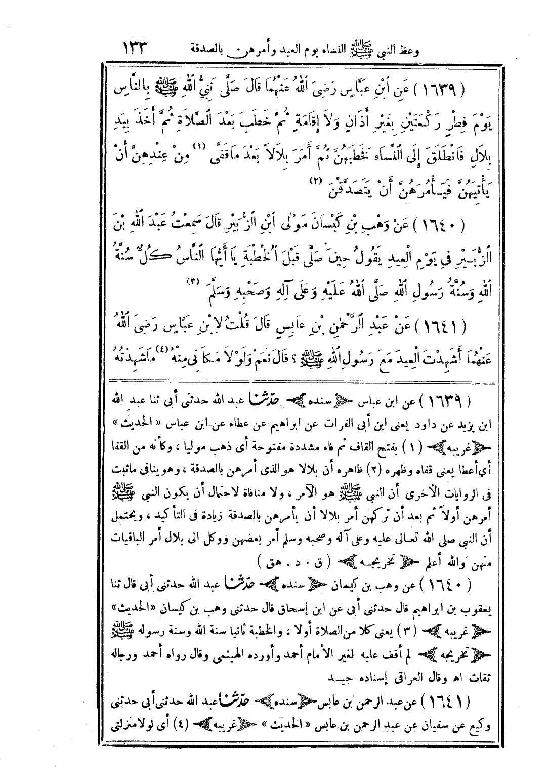 (1639) عن ابن عبَّاسٍ رضى الله عنهما قال صلَّى نبيُّ الله (صلى الله عليه وسلم) بالنَّاس يوم فطرٍ ركعتين بغير أذانٍ ولا إقامةٍ ثمَّ خطب بعد الصَّلاة ثمَّ أخذ بيد بلالٍ فانطلق إلى النِّساء فخطبهن ثمَّ أمر بلالاً بعد ما قفىَّ (1) من عندهنَّ أن يأتيهنَّ فيأمرهنَّ أن يتصدَّقن (2)
