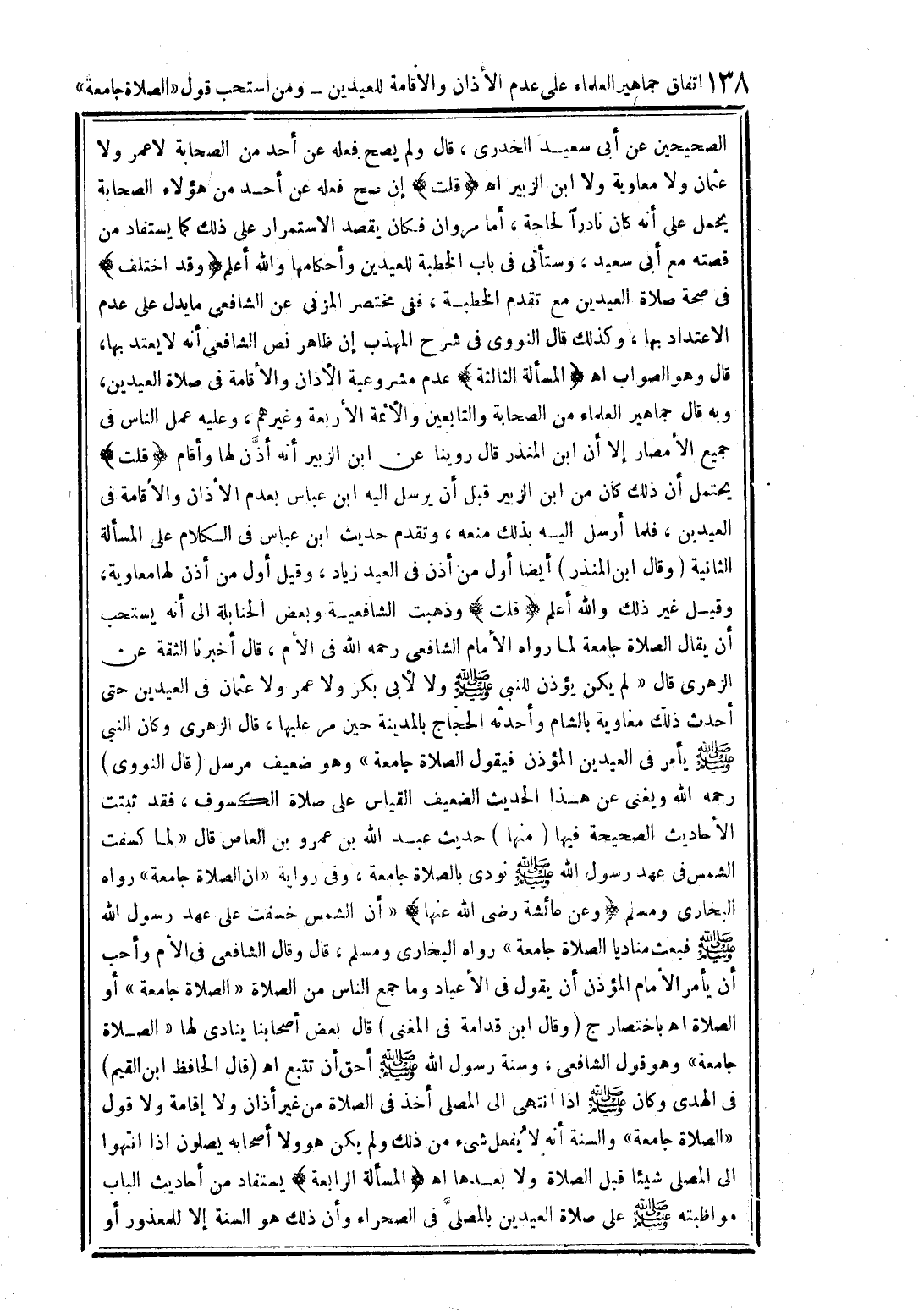 -[إتفاق جماهير العلماء على عدم الأذان والإقامة للعيدين - ومن استحب قول "الصلاة جامعة"]-
