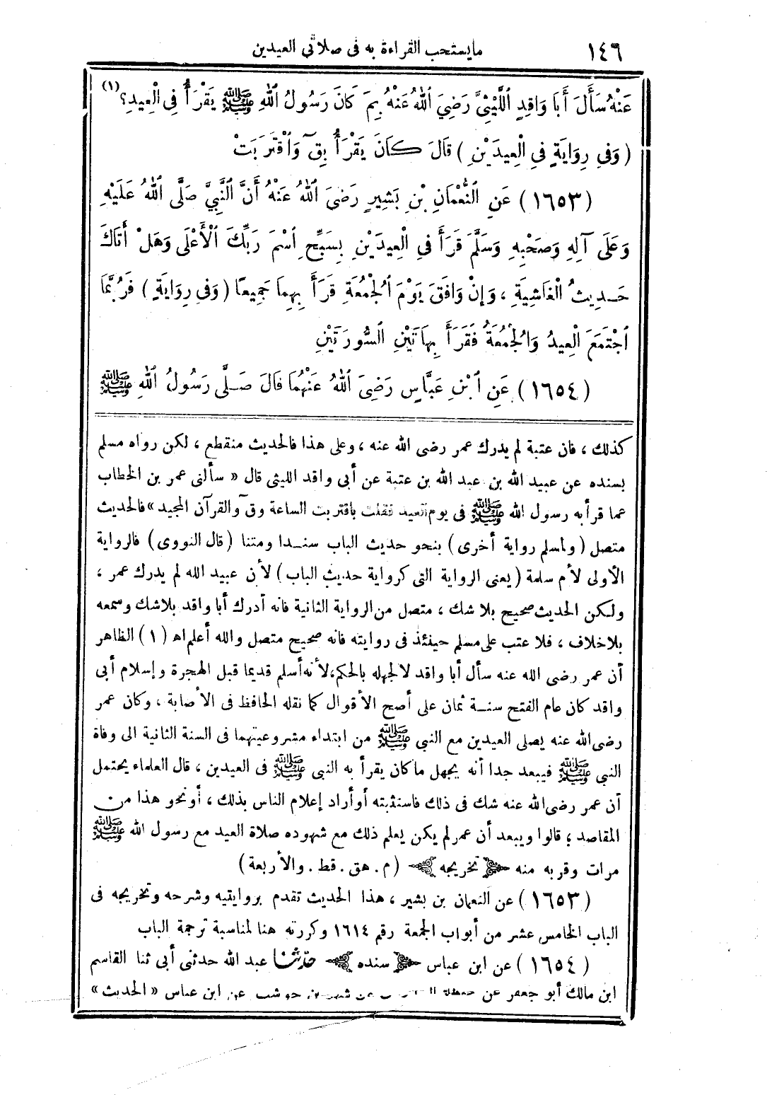 (1653) عن النُّعمان بن بشيرٍ رضى الله عنه أنَّ النَّبيَّ صلَّى الله عليه وعلى آله وصحبه وسلَّم قرأ فى العيدين بسبِّح اسم ربِّك الأعلى وهل أتاك حديث الغاشية، وإن وافق يوم الجمعة قرأ بهما جميعًا (وفى روايةٍ) فربَّما اجتمع العيد والجمعة فقرأ بهاتين السُّورتين
