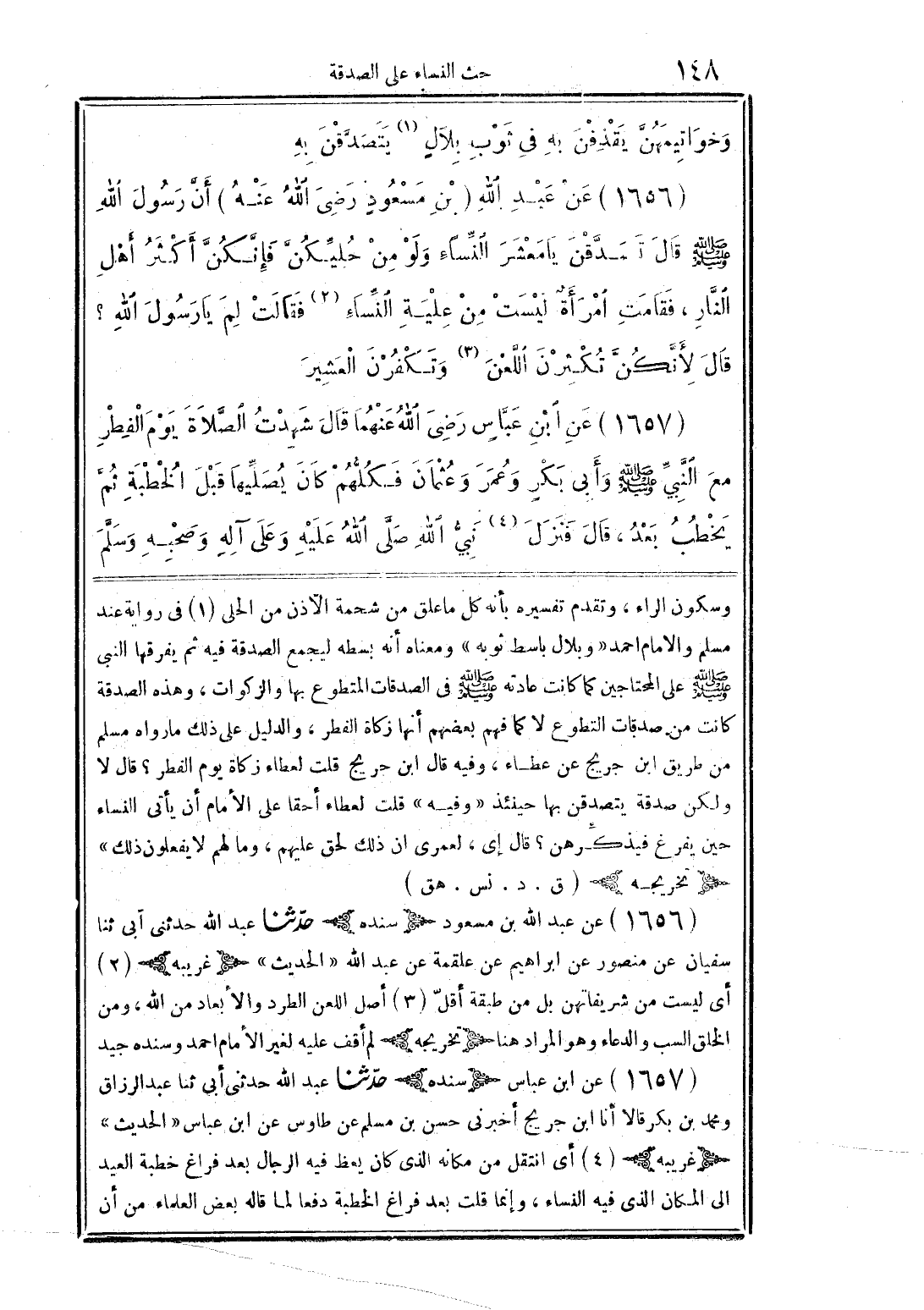 (1656) عن عبد الله (بن مسعودٍ رضى الله عنه) أنَّ رسول الله (صلى الله عليه وسلم) قال تصدَّقن يا معشر النِّساء ولو من حليِّكنَّ فإنَّكنَّ أكثر أهل النَّار، فقامت امرأةٌ ليست من علية النِّساء (2) فقالت لم يا رسول الله؟ قال لأنَّكن تكثرن اللَّعن (3) وتكفرن العشير