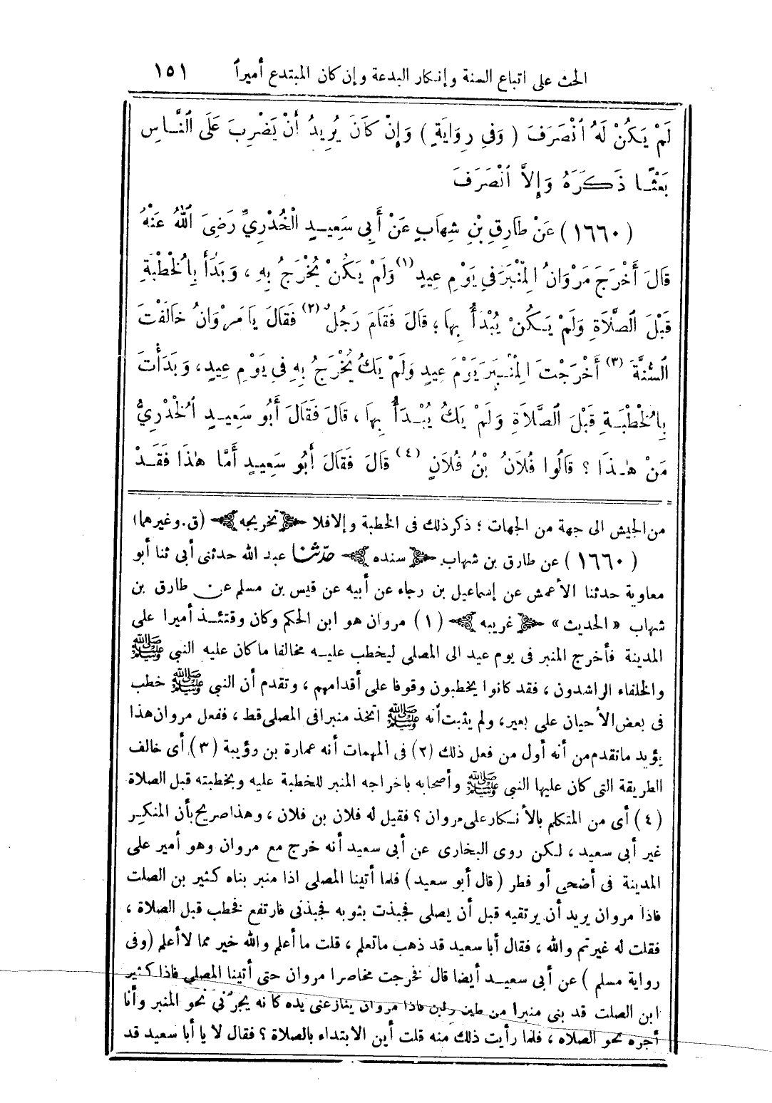 (1660) عن طارق بن شهابٍ عن أبى سعيدٍ الخدريِّ رضى الله عنه قال أخرج مروان المنبر فى يوم عيدٍ (1) ولم يكن يخرج به، وبدأ بالخطبة قبل الصلاَّة ولم يكن يبدأ بها؛ قال فقام رجلٌ (2) فقال يا مروان خالفت السُّنَّة (3) أخرجت المنبر يوم عيدٍ ولم يك يخرج به فى يوم عيدٍ، وبدأت بالخطبة قبل الصَّلاة ولم يك يبدأ بها، قال فقال أبو سعيدٍ الخدريُّ من هذا؟ قالوا فلان بن فلانٍ (4) قال فقال أبو سعيدٍ أمّا هذا فقد