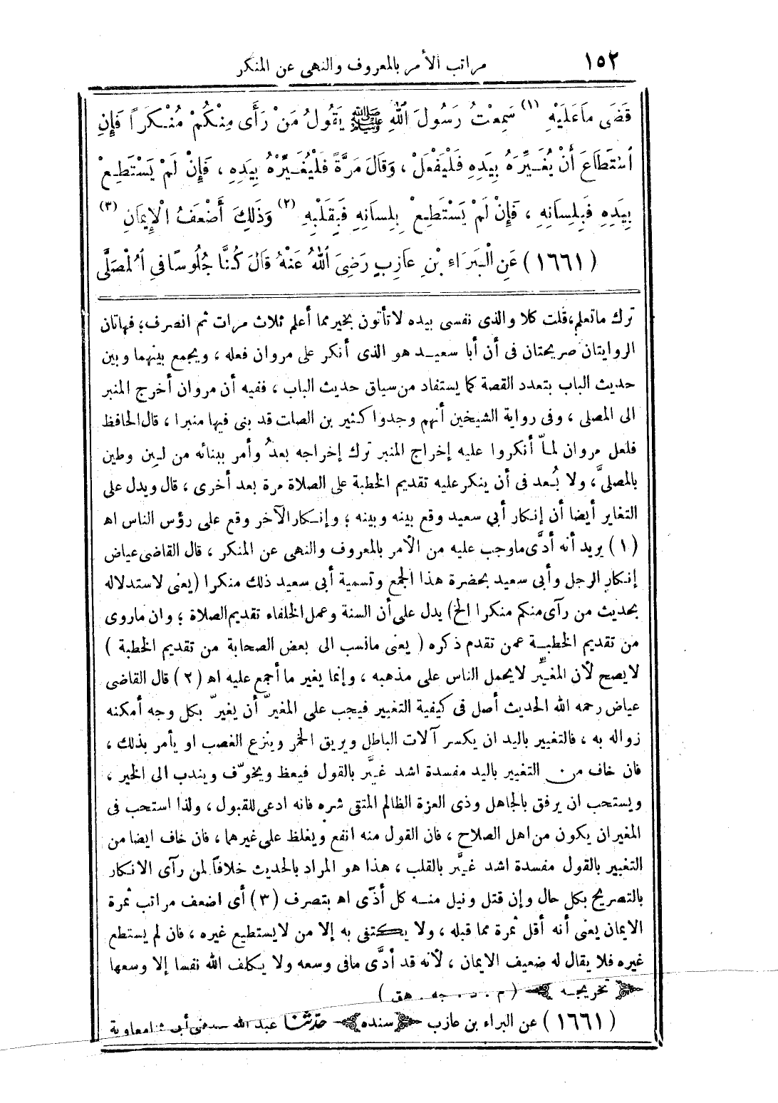 ترك ما تعلم، قلت كلا والذى نفسى بيده لا تأتون بخير مما أعلم ثلاث مرات ثم انصرف؛ فهاتان الروايتان صريحتان في أن أبا سعيد هو الذى أنكر على مروان فعله، ويجمع بينهما وبين حديث الباب بتعدد القصة كما يستفاد من سياق حديث الباب، ففيه أن مروان أخرج المنبر إلى المصلى، وفي رواية الشيخين أنهم وجدوا كثير بن الصلت قد بنى فيها منبرا، قال الحافظ فلعل مروان لما أنكروا عليه إخراج المنبر ترك إخراجه بعدُ وأمر ببنائه من لبِن وطين بالمصلىَّ، ولا بُعد في أن ينكر عليه تقديم الخطبة على الصلاة مرة بعد أخرى، قال ويدل على التغاير أيضا أن إنكار أبى سعيد وقع بينه وبينه؛ وإنكار الآخر وقع على رؤوس الناس اهـ (1) يريد أنه أدَّى ما وجب عليه من الأمر بالمعروف والنهى عن المنكر، قال القاضى عياض إنكار الرجل وأبى سعيد بحضرة هذا الجمع وتسمية أبي سعيد ذلك منكرا (يعنى لاستدلاله بحديث من رآى منكم منكرا الخ) يدل على أن السنة وعمل الخلفاء تقديم الصلاة؛ وان ما روى من تقديم الخطبة عمن تقدم ذكره (يعنى ما نسب الى بعض الصحابة من تقديم الخطبة) لا يصح أن المغيِّر لا يحمل الناس على مذهبه، وإنما يغير ما أجمع عليه اهـ (2) قال القاضى عياض رحمه الله الحديث أصل في كيفية التغيير فيجب على المغير أن يغيّر بكل وجه أمكنه زواله به، فالتغيير باليد ان يكسر آلات الباطل ويريق الخمر وينزع الغصب أو يأمر بذلك، فإن خاف من التغيير باليد مفسدة اشد غيّر بالقول فيعظ ويخوّف ويندب إلى الخير، ويستحب أن يرفق بالجاهل وذى العزة الظالم المتقى شره فانه ادعى للقبول، ولذا استحب في المغير ان يكون من اهل الصلاح، فان القول منه انفع ويغلظ على غيرهما، فان خاف ايضا من التغيير بالقول مفسدة اشد غيّر بالقلب، هذا هو المراد بالحديث خلافاً لمن رآى الانكار بالتصريح بكل حال وإن قتل ونيل منه كل أذّى اهـ بتصرف (3) أي اضعف مراتب ثمرة الايمان يعنى أنه اقل ثمرة مما قبله، ولا يكتفى به إلا من لا يستطيع غيره، فان لم يستطع غيره فلا يقال له ضعيف الإيمان، لأنه قد أدَّى ما فى وسعه ولا يكلف الله نفسا إلا وسعها {تخريجه} (م.؟؟؟؟؟؟؟؟؟؟؟؟)