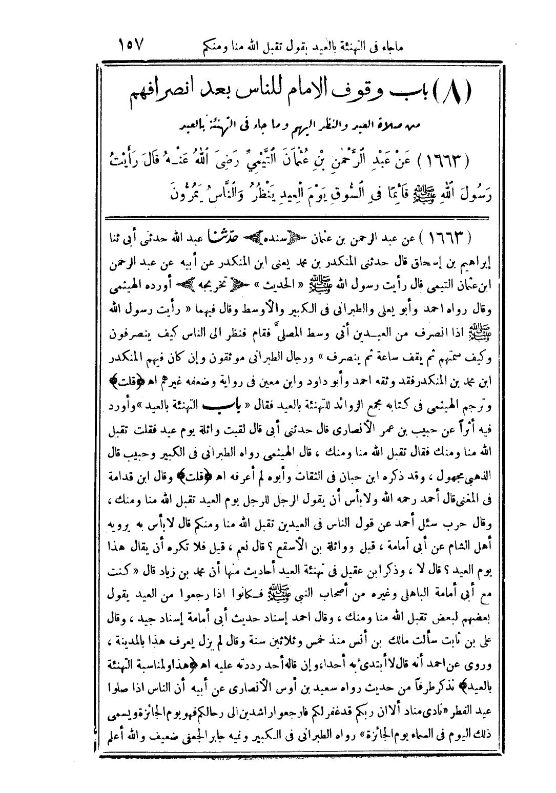 (1663) عن عبد الرَّحمن بن عثمان التَّيميِّ رضى الله عنه قال رأيت رسول الله (صلى الله عليه وسلم) قائمًا فى السُّوق يوم العيد ينظر والنَّاس يمرُّون