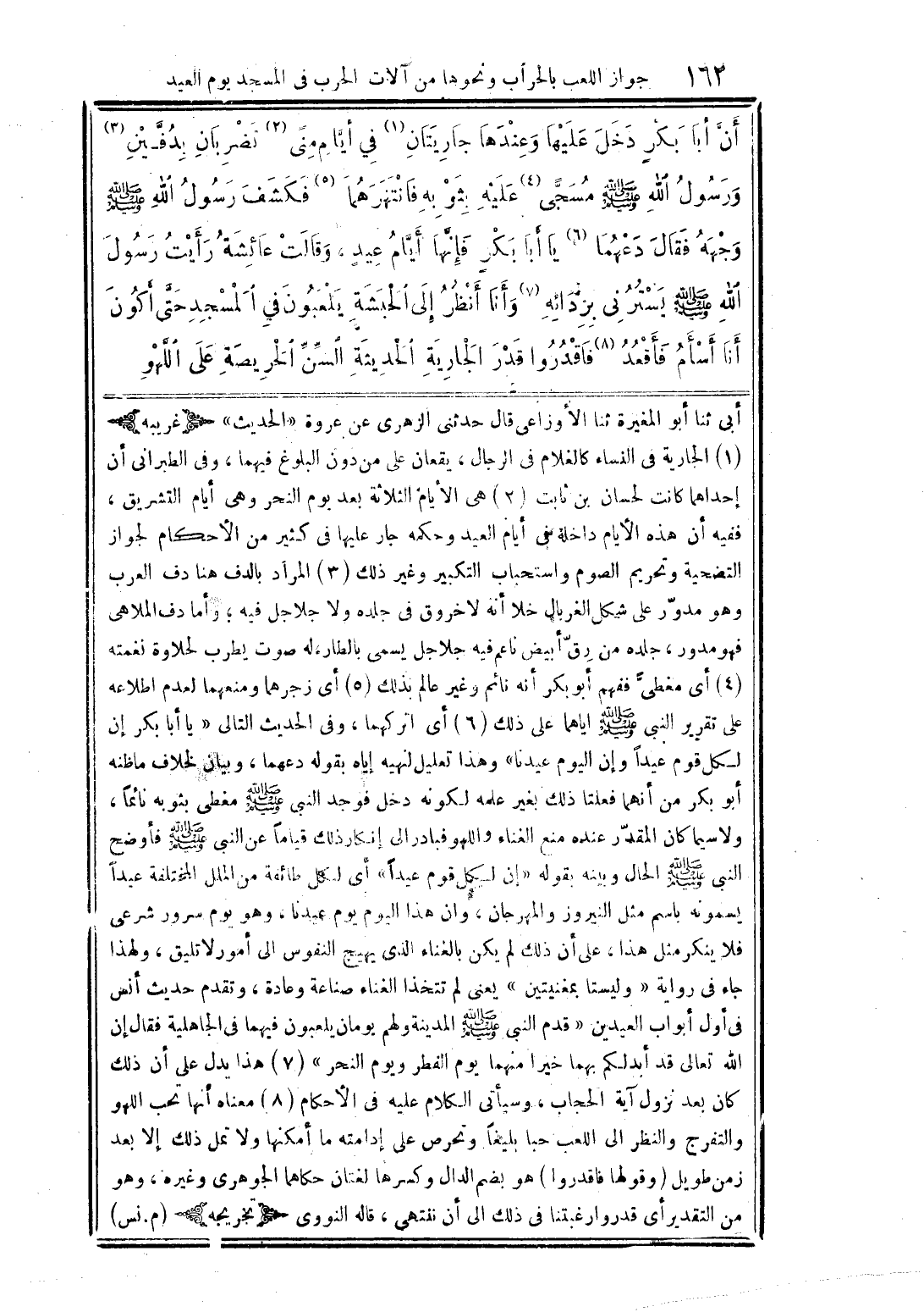 أنَّ أبا بكرٍ دخل عليها وعندها جاريتان (1) فى أيَّام منى (2) تضربان بدفَّين (3) ورسول الله (صلى الله عليه وسلم) مسجًّى (4) عليه بثوبه فانتهزهما (5) فكشف رسول الله (صلى الله عليه وسلم) وجهه فقال دعهما (6) يا أبا بكر فإنَّها أيَّام عيدٍ، وقالت عائشة رأيت رسول الله (صلى الله عليه وسلم) يسترني بردائه (7) وأنا أنظر إلى الحبشة يلعبون فى المسجد حتَّى أكون أنا أسأم فأقعد (8) فاقدروا قدر الجارية الحديثة السِّنِّ الحريصة على اللَّهو