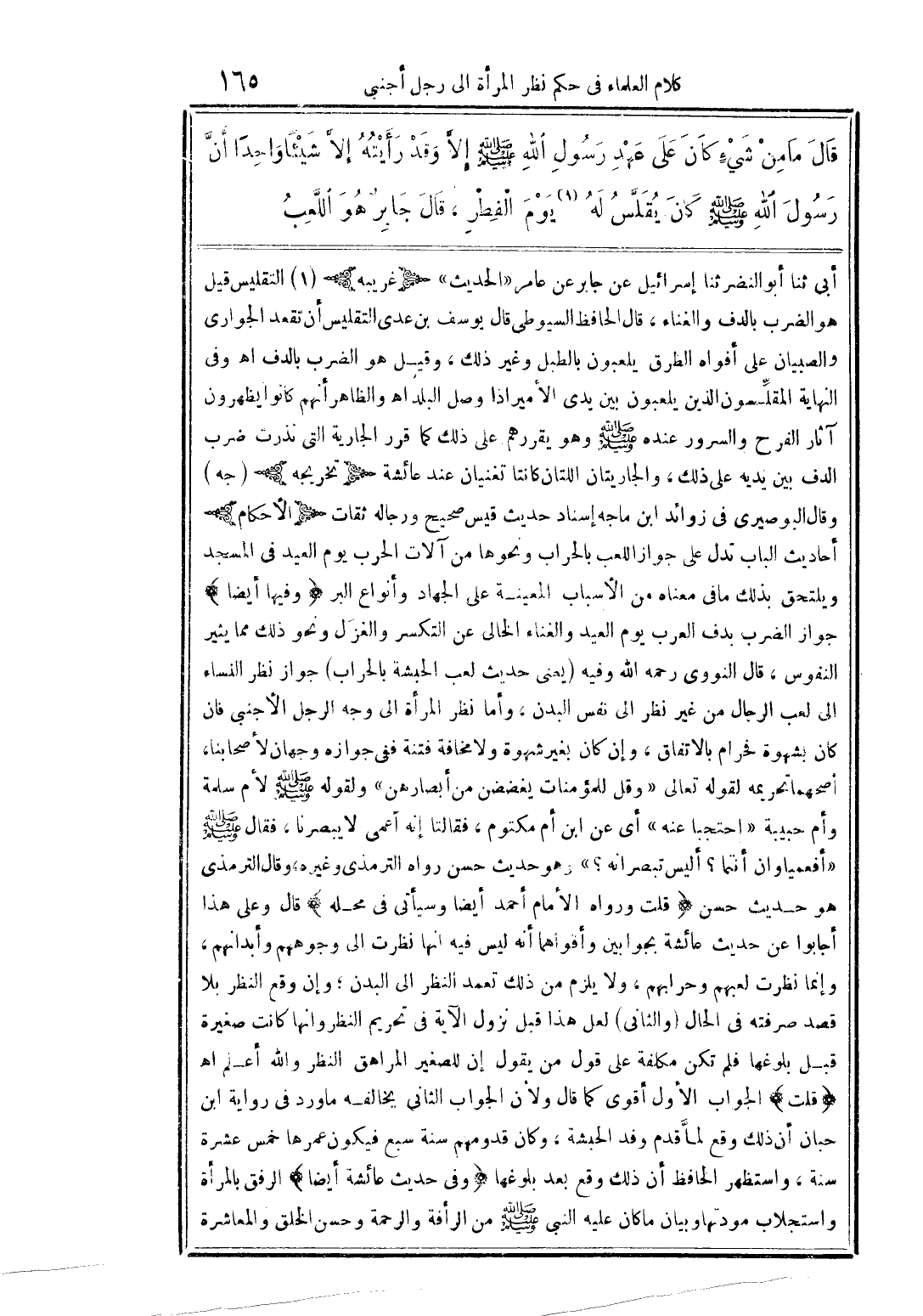 أبي ثنا أبو النضر ثنا إسرائيل عن جابر عن عامر "الحديث" {غريبه} (1) التقليس قيل هو الضرب بالدف والغناء، قال الحافظ السيوطى قال يوسف بن عدى التقليس أن تقعد الجوارى والصبيان على أفواه الطرق يلعبون بالطبل وغير ذلك، وقيل هو الضرب بالدف اهـ وفى النهاية المقلِّسون الذين يلعبون بين يدى الأمير اذا وصل البلد اهـ والظاهر أنهم كانوا يظهرون آثار الفرح والسرور عند صلى الله عليه وسلم وهو يقررهم على ذلك كما قرر الجارية التى نذرت ضرب الدف بين يديه على ذلك، والجاريتان اللتان كانتا تغنيان عند عائشة {تخريجه} (جه) وقال البوصيرى في زوائد ابن ماجه إسناد حديث قيس صحيح ورجاله ثقات {الأحكام} أحاديث الباب تدل على جواز اللعب بالحراب ونحوها من آلات الحرب يوم العيد في المسجد ويلتحق بذلك ما في معناه من الأسباب المعينة على الجهاد وأنواع البر {وفيها أيضاً} جواز الضرب بدف العرب يوم العيد والغناء الخالى من التكسير والغزل ونحو ذلك مما يثير النفوس، قال النووى رحمه الله وفيه (يعنى حديث لعب الحبشة بالحراب) جواز نظر النساء إلى لعب الرجال من غير نظر إلى نفس البدن، وأما نظر المرأة إلى وجه الرجل الأجنبى فان كان بشهوة فحرام بالاتفاق، وإن كان بغير شهوة ولا مخافة فتنة ففى جوازه وجهان لأصحابنا، أصحهما تحريمه لقوله تعالى {وقل للمؤمنات يغضضن من أبصارهن} ولقوله صلى الله عليه وسلم لأم سلمة وأم حبيبة "احتجبا عنه" أى عن ابن أم مكتوم، فقلنا إنه أعمى لا يبصرنا، فقال صلى الله عليه وسلم "أفعمياوان أنتما؟ أليس تبصرانه؟ " وهو حديث حسن رواه الترمذى وغيره، وقال الترمذى هو حديث حسن {قلت ورواه الأمام أحمد أيضاً وسيأتى في محله} قال وعلى هذا أجابوا عن حديث عائشة بجواربين وأقواهما أنه ليس فيه أنها نظرت إلى وجوههم وأبدانهم، وإنما نظرت لعبهم وحرابهم، ولا يلزم من ذلك تعمد النظر إلى البدن؛ وإن وقع النظر بلا قصد صرفته في الحال (والثانى) لعل هذا قبل نزول الآية في تحريم النظر وانها كانت صغيرة قبل بلوغها فلم تكن مكلفة على قول من يقول إن للصغير المراهق النظر والله أعلم اهـ {قلت} الجواب الأول أقوى كما قال ولأن الجواب الثانى يخالفه ما ورد في رواية ابن حبان أن ذلك وقع لمَّا قدم وفد الحبشة، وكان قدومهم سنة سبع فيكون عمرها خمس عشرة سنة، واستظهر الحافظ أن ذلك وقع بعد بلوغها {وفي حديث عائشة أيضاً} الرفق بالمرأة واستجلاب مودتها وبيان ما كان عليه النبي صلى الله عليه وسلم من الرأفة والرحمة وحسن الخلق والمعاشرة