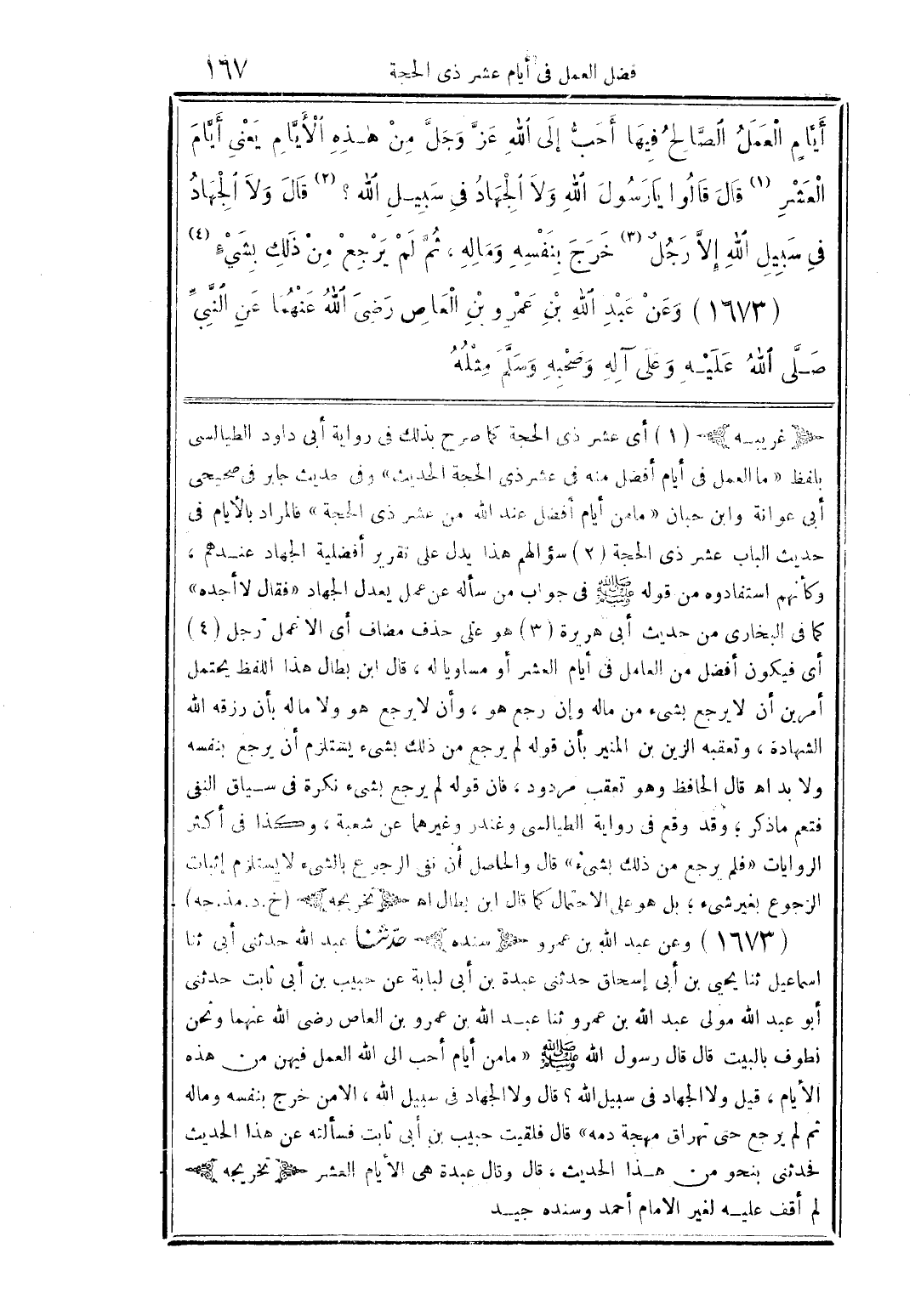 أيامٍ العمل الصَّالح فيها أحبُّ إلى الله عزَّ وجلَّ من هذه الأيَّام يعنى أيَّام العشر (1) قال قالوا يا رسول الله ولا الجهاد فى سبيل الله؟ (2) قال ولا الجهاد فى سبيل الله إلاَّ رجلٌ (3) خرج بنفسه وماله، ثمَّ لم يرجع من ذلك بشيءٍ (4)