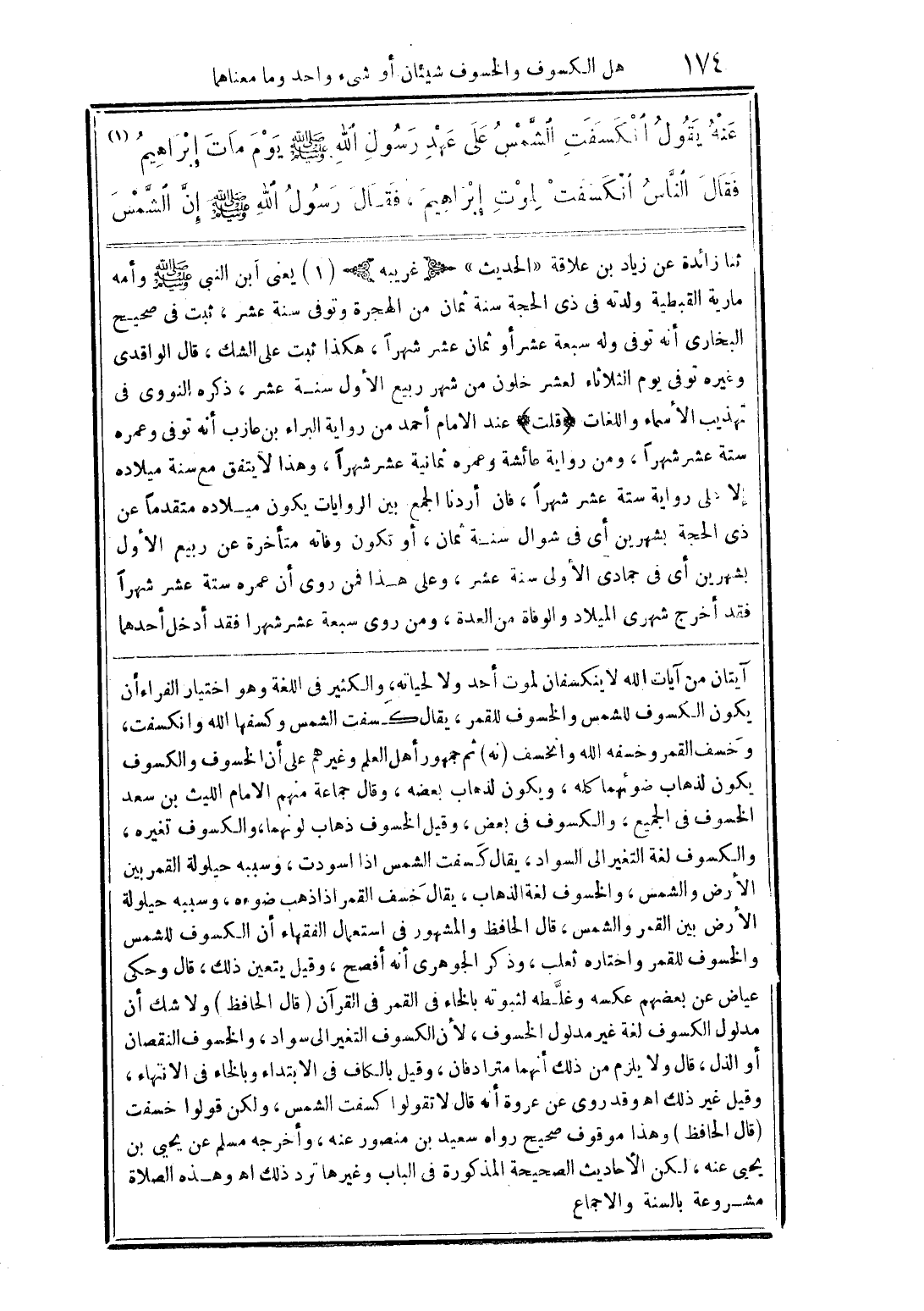 آياتان من آيات الله لا ينكسفان لموت أحد ولا لحياته، والكثير في اللغة وهو اختيار الفراء أن يكون الكسوف للشمس والخسوف للقمر، يقال كسفت الشمس وكسفها الله وانكسفت، وخَسف القمر وخسفه الله وانخسف (نه) ثم جمهور أهل العلم وغيرهم على أن الخسوف والكسوف يكون لذهاب ضوئهما كله، ويكون لذهاب بعضه، وقال جماعة منهم الامام الليث بن سعد الخسوف في الجميع، والكسوف في بعض، وقيل الخسوف ذهاب لونهما، والكسوف تغيره، والكسوف لغة التغير إلى السواد، يقال كَسفت الشمس اذا استودت، وسببه حيلولة القمرين الأرض والشمس، والخسوف لغة الذهاب، يقال خَسف القمر اذا ذهب ضوءه، وسببه حيلولة الأرض بين القمر والشمس، قال الحافظ والمشهور في استعمال الفقهاء أن الكسوف للشمس والخسوف للقمر واختاره ثعلب، وذكر الجوهرى أنه أفصح، وقيل يتعين ذلك، قال وحكى عياض عن بعضهم عكسه وغلَّطه لثبوته بالخاء في القمر في القرآن (قال الحافظ) ولا شك أن مدلول الكسوف لغة غير مدلول الخسوف، لأن الكسوف التغير إلى سواد، والخسوف النقصان وقيل غير ذلك اهـ وقد روى عن عروة أنه قال لا تقولوا كسفت الشمس، ولكن قولوا خسفت (قال الحافظ) وهذا موقوف صحيح رواه سعيد بن منصور عنه، وأخرجه مسلم عن يحيى بن يحيى عنه، لكن الأحاديث الصحيحة المذكورة في الباب وغيرها ترد ذلك اهـ وهذه الصلاة مشروعة بالسنة والإجماع